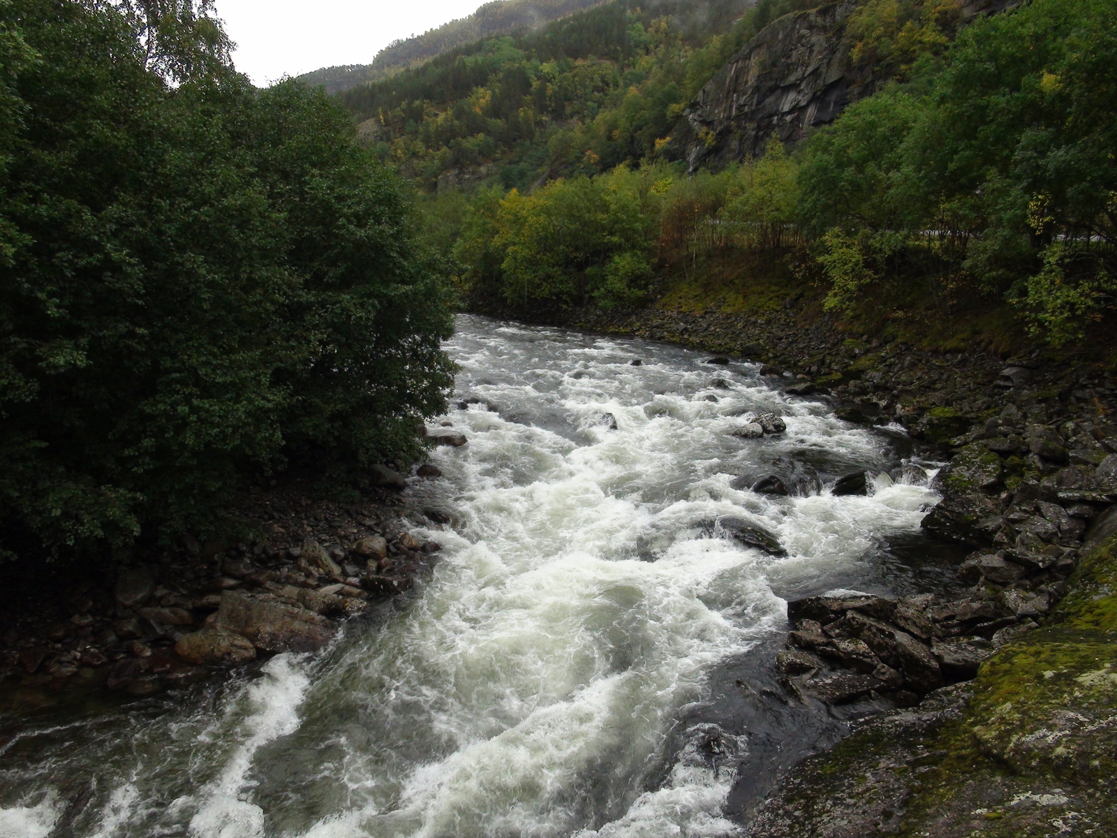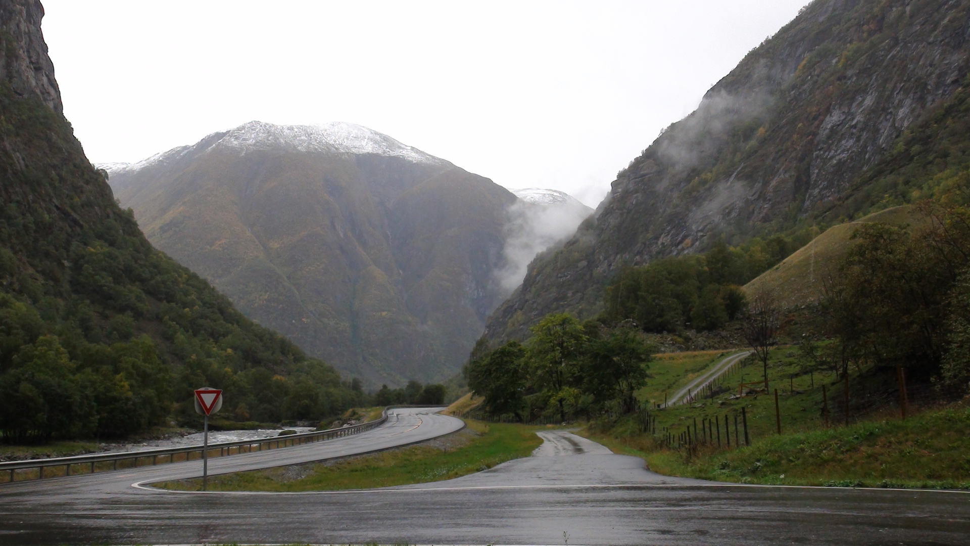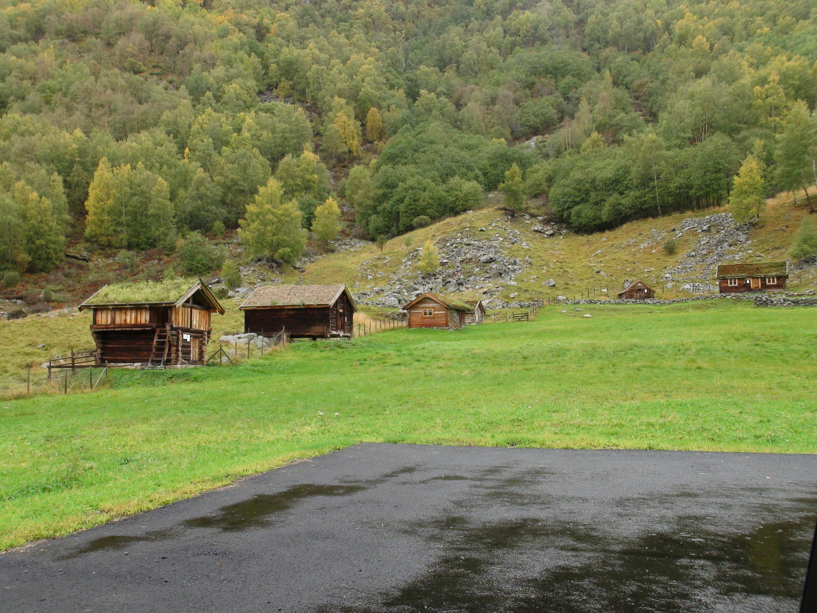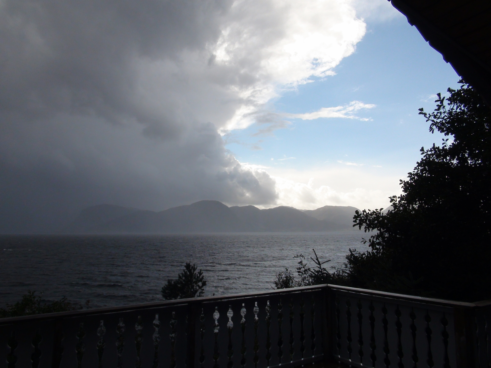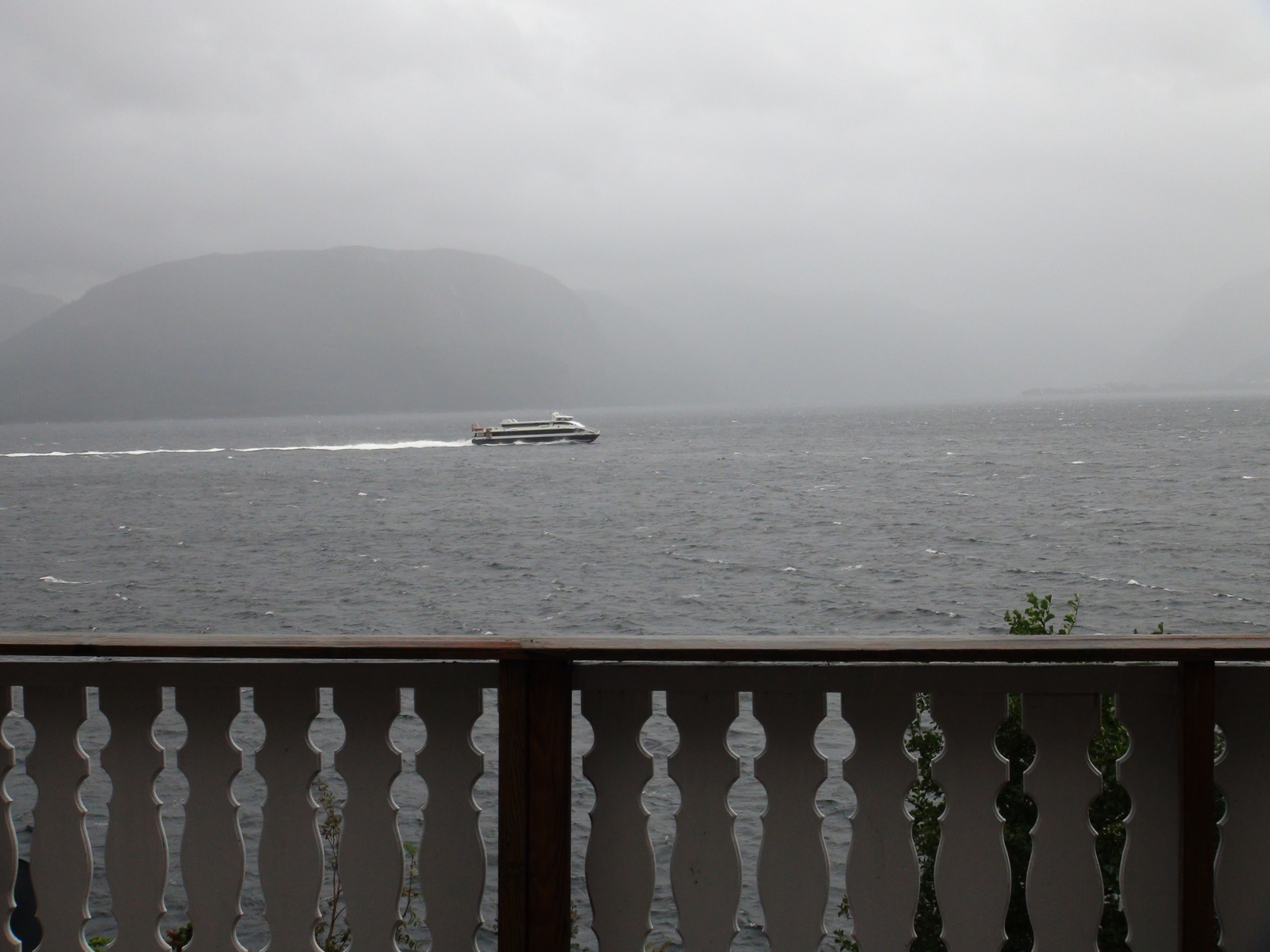 Es ist nicht kalt draußen und Gewitter ist für heute Nachmittag ja auch noch angesagt. Mittags wird's heller und die Sonne kommt sogar raus. Manchmal wirkt es hier wie ein Weltuntergang, auf der einen Seite scheint die Sonne und in Richtung Fjordinneres (Balestrand) ist es dunkel ohne Ende. Und es stürmt weiter.