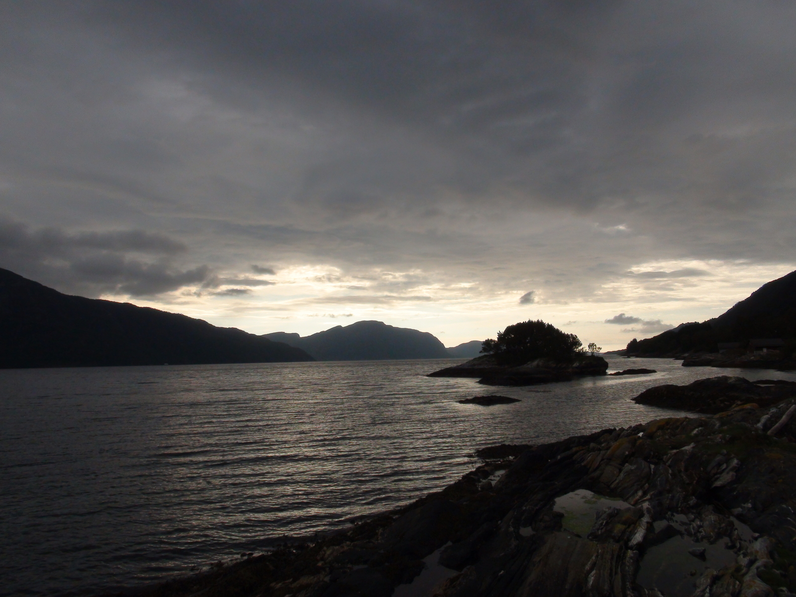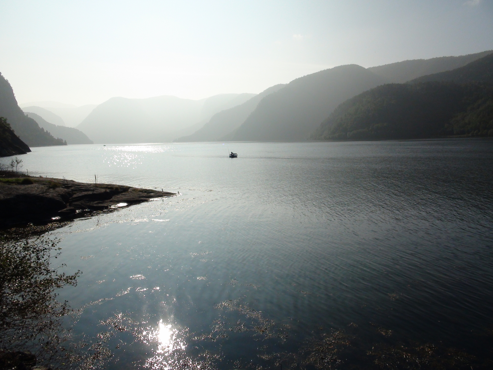 Bei Svartemyr gibt es einen alten Fähranleger und da ich oft etwas Angelgerödel bei habe, schmiss ich dort mal meine Angel aus. Das Wetter ist herrlich, warm, das Wasser ist spiegelglatt. Ich ziehe dort zwar kein Fisch aus dem Wasser, was ja auch nicht weiter schlimm ist.
