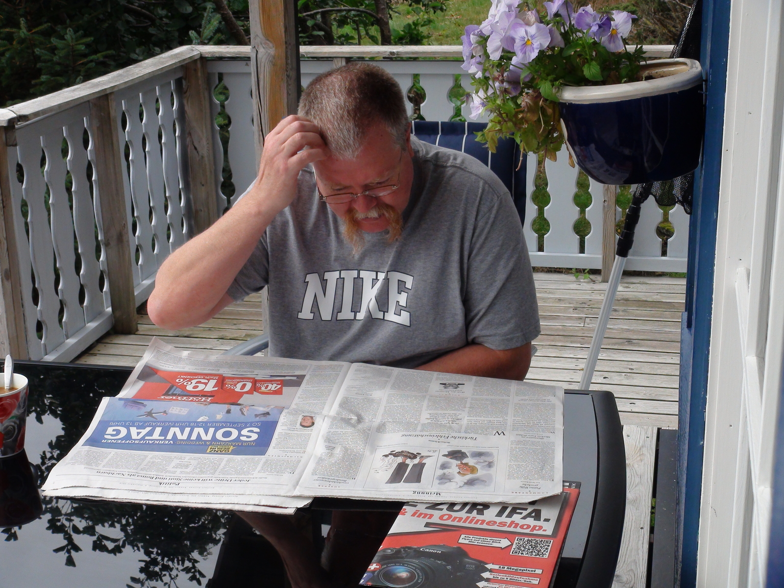 Es ist bewölkt und die Wolken hängen tief. Entgegen yr.no zeigt sich keine Sonne und der Wind ist auch stärker. Vor unserem Haus ist er auflandig und ein paar hundert Meter weiter ablandig. Sieht kurios aus, auf dem Wasser. Ist uns so noch nie aufgefallen.