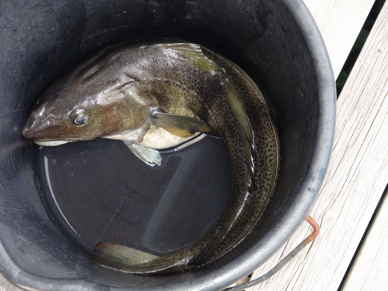 Ich fuhr mal zum Bootshafen und checkte die Lage mal ab. Und dann entschloss ich mich, mit dem Boot mal rauszufahren. Erstmal will ich in Richtung Lavik, doch dort habe ich kein Glück. Also, gings wieder zu "meinem" Platz, um die Spitze rum. Doch da habe ich nach 5 Minuten die Flucht ergriffen, wegen Wind und Wellen. An einer geschützteren Stelle hatte ich etwas mehr Glück. In 40 Meter Tiefe biss ein Dorsch von 63cm auf einen Beifänger. Ein kleinerer Köhler darf weiterschwimmen.