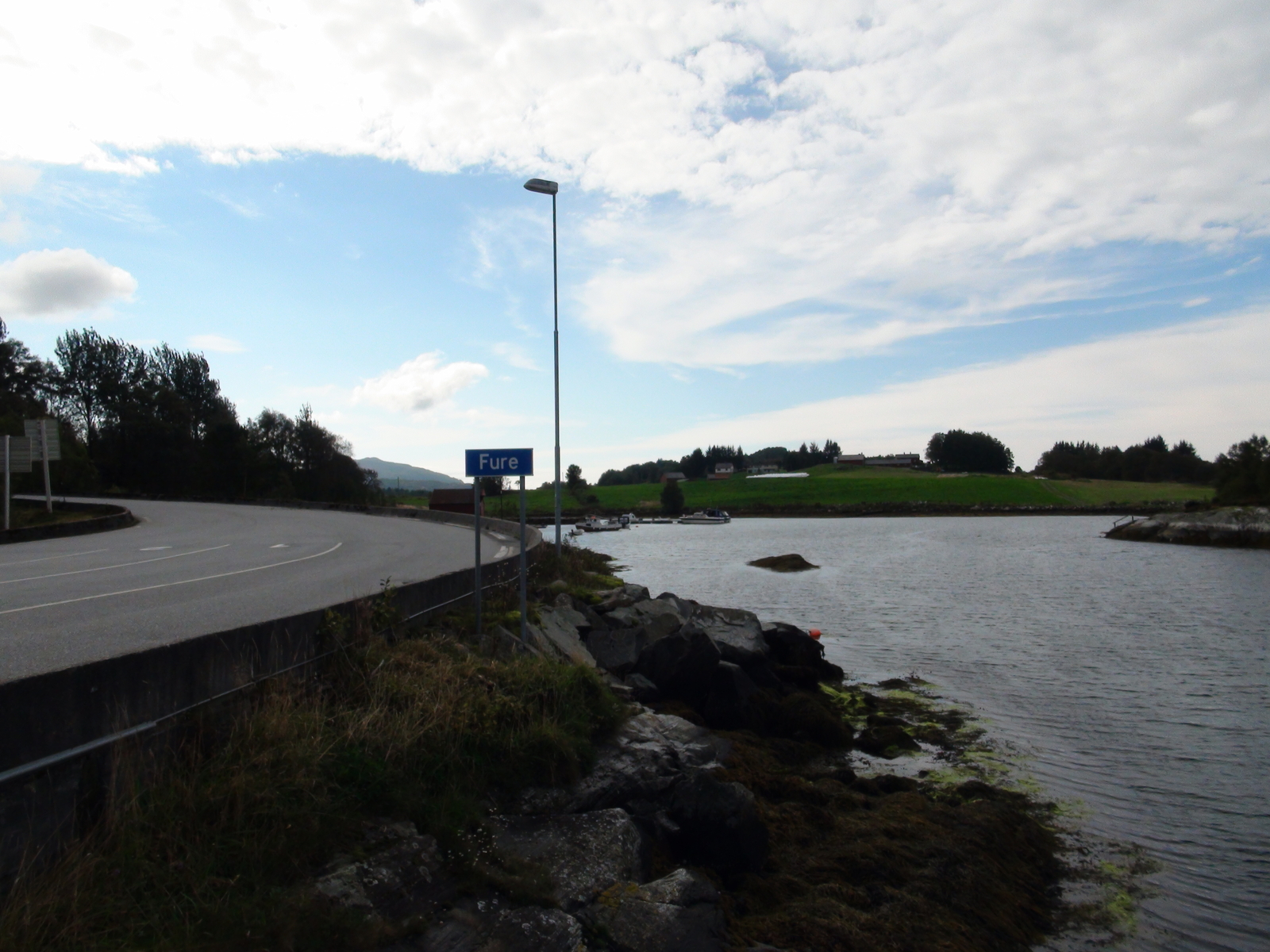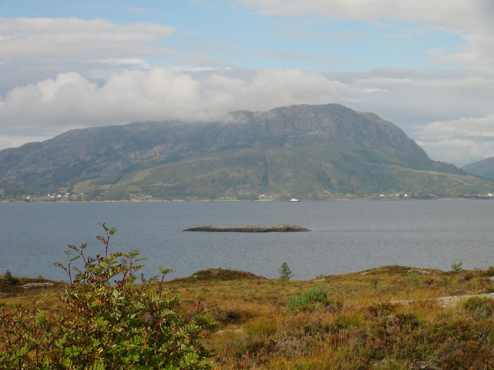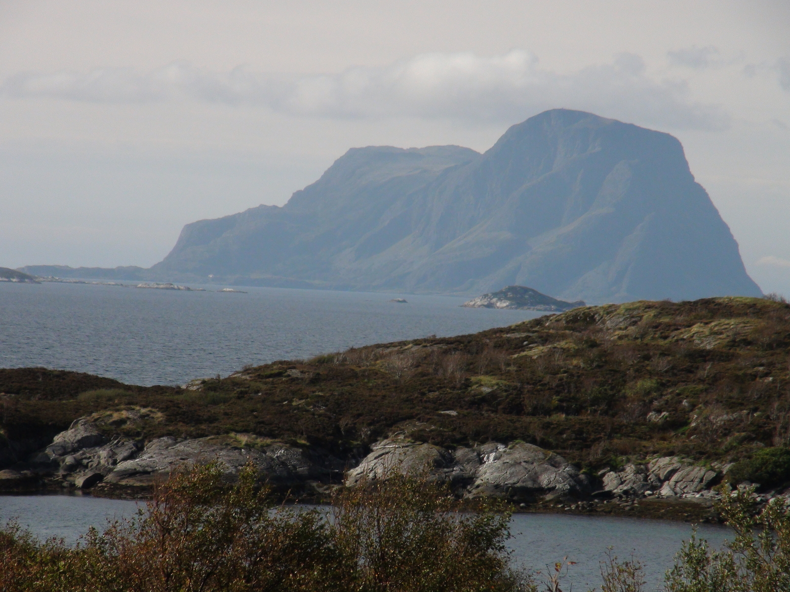 Von der RV607 sind wir wieder mal auf eine kleinere Straße abgebogen und immer der Küste entlanggefahren. Natürlich ergaben sich schöne Aussichten, u.a. haben wir die Berge des Dalsfjordes gesehen. Aber auch einen gigantischen Fels, welcher sich aus dem Meer erhebt. Es ist der "norske hesten", der fast senkrecht 481 Meter aus dem Meer ragt und in mehr als 100km Entfernung vom Meer aus zu sehen ist. Dadurch ist er natürlich eine markante Orientierungshilfe für die Seefahrer. Ein markierter Pfad soll zum Gipfel des Riesen führen. Diese Aussicht muss bei schönem Wetter phantastisch sein.