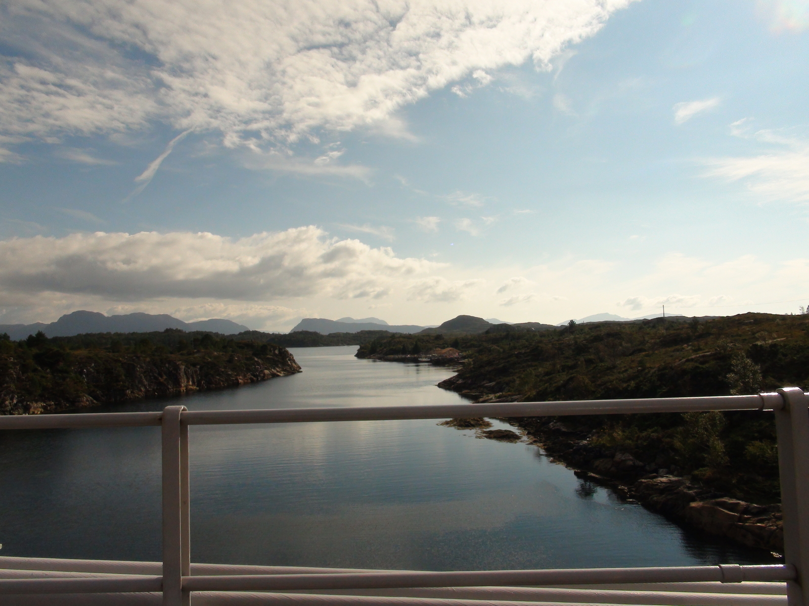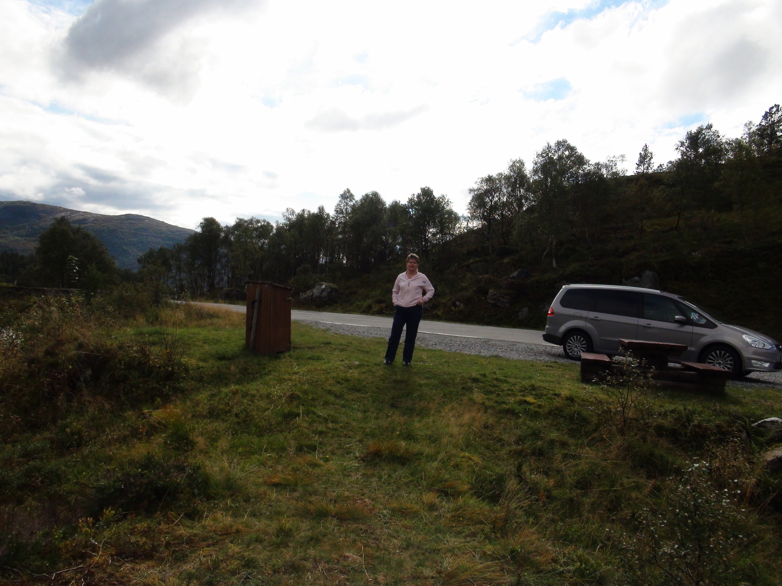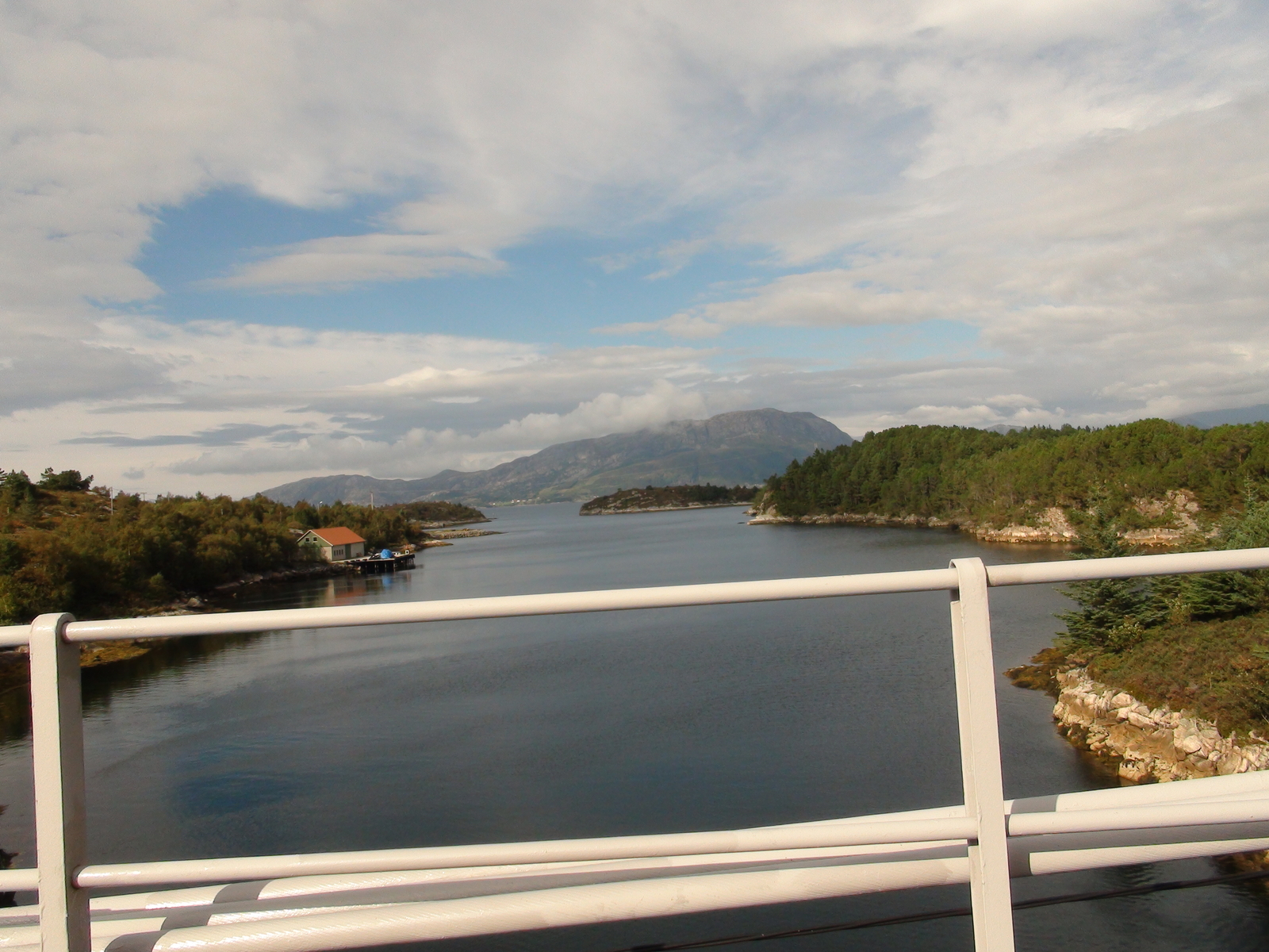 Von der RV607 sind wir wieder mal auf eine kleinere Straße abgebogen und immer der Küste entlanggefahren. Natürlich ergaben sich schöne Aussichten, u.a. haben wir die Berge des Dalsfjordes gesehen. Aber auch einen gigantischen Fels, welcher sich aus dem Meer erhebt. Es ist der "norske hesten", der fast senkrecht 481 Meter aus dem Meer ragt und in mehr als 100km Entfernung vom Meer aus zu sehen ist. Dadurch ist er natürlich eine markante Orientierungshilfe für die Seefahrer. Ein markierter Pfad soll zum Gipfel des Riesen führen. Diese Aussicht muss bei schönem Wetter phantastisch sein.