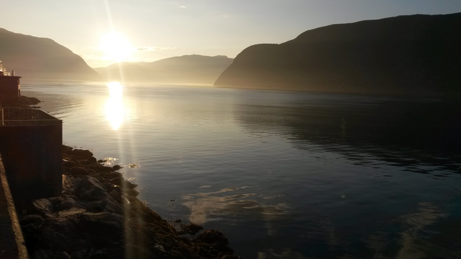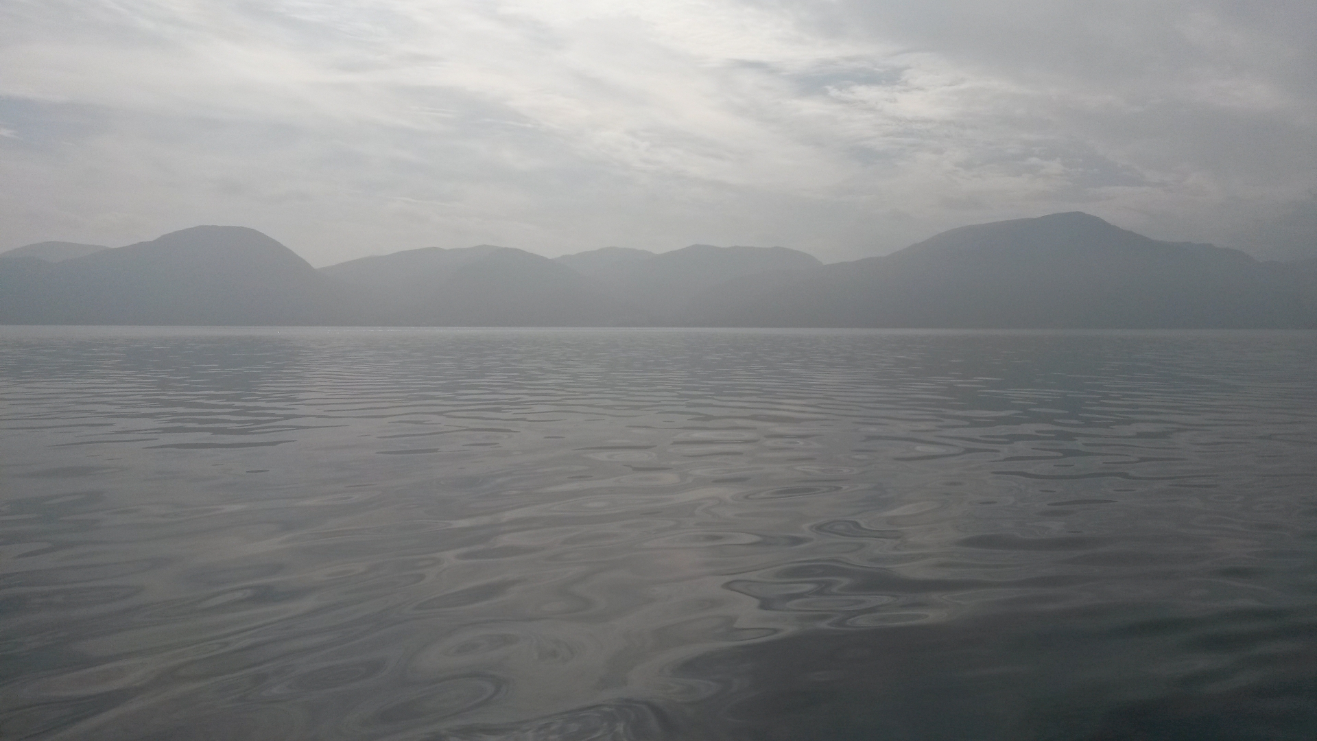 Es ist schön, doch die Sicht ist so diesig hier, dass man kaum die gegenüberliegende Seite sehen kann. Als die Sonne rauskommt, ist es herrlich warm auf der Terrasse, wir fühlen uns wie im Sommerurlaub. Die Sonne blendet, dafür glitzert das Wasser herrlich im Sonnenschein.