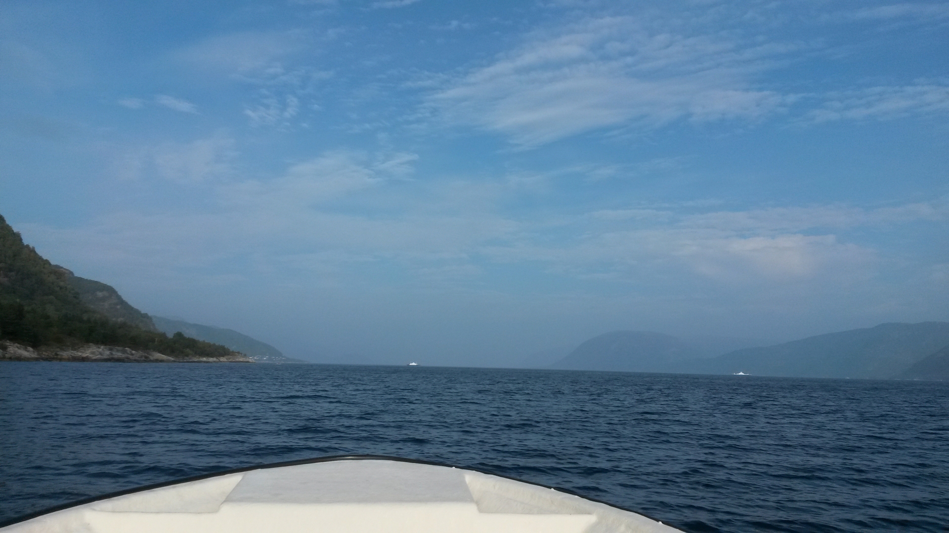 Udo fährt angeln. Ich schreibe Postkarten an die lieben Daheimgebliebenen, draußen auf der Terrasse in der Sonne. So oft schweift mein Blick auf den Fjord, ich bin froh und glücklich, hier zu sein. Ich springe auf, als ich die Schweinswale prusten höre, dann sehe ich sie und bin wieder angetan von diesen Tieren. Auch ein Segelboot schippert wieder vorbei. Sofort denkt man an Christian!Hallo Nordmann 1!!!