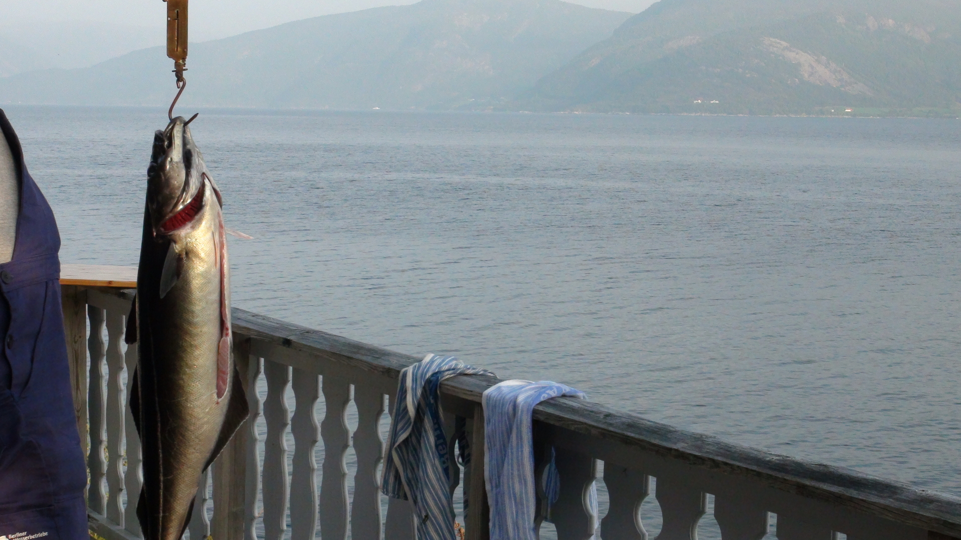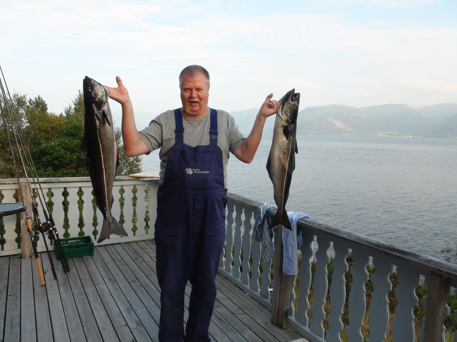 Am frühen Abend kommt Udo zurück. Er ist wieder um die Spitze gefahren und hat wieder in Höhe Brendsdal sein Glück versucht. Etliche Makrelen bissen in ca. 50m Tiefe auf blaue Pilker und gelbe Beifänger. 7 Makrelen nahm er mit, die größte war um die 40cm, die kleineren hat er wieder reingesetzt. Die Makrelen waren zum Teil dick und fett. Weiter drin, im Bøfjord, in Höhe Stavsneset, fing er noch 2 Makrelen und 2 Köhler (Seelachse). Auch die Köhler bissen in einer Tiefe von 50 Meter und natürlich auf blaue Pilker. Ein Seelachs war 80cm groß und 6kg schwer, der andere hatte eine Größe von 84cm und war 7,5kg schwer.