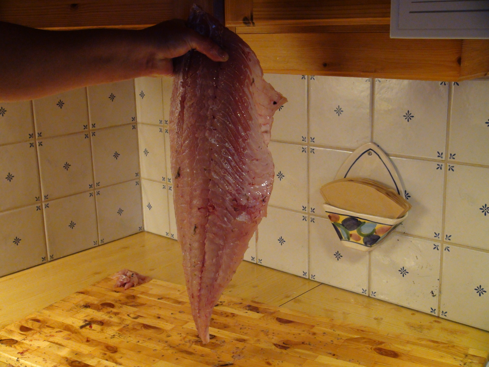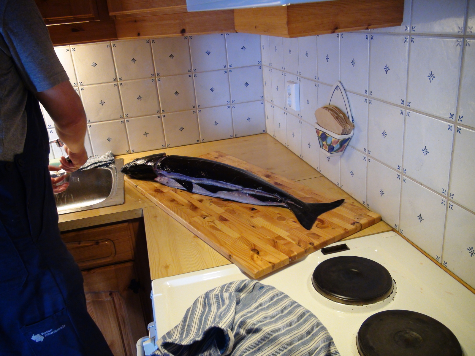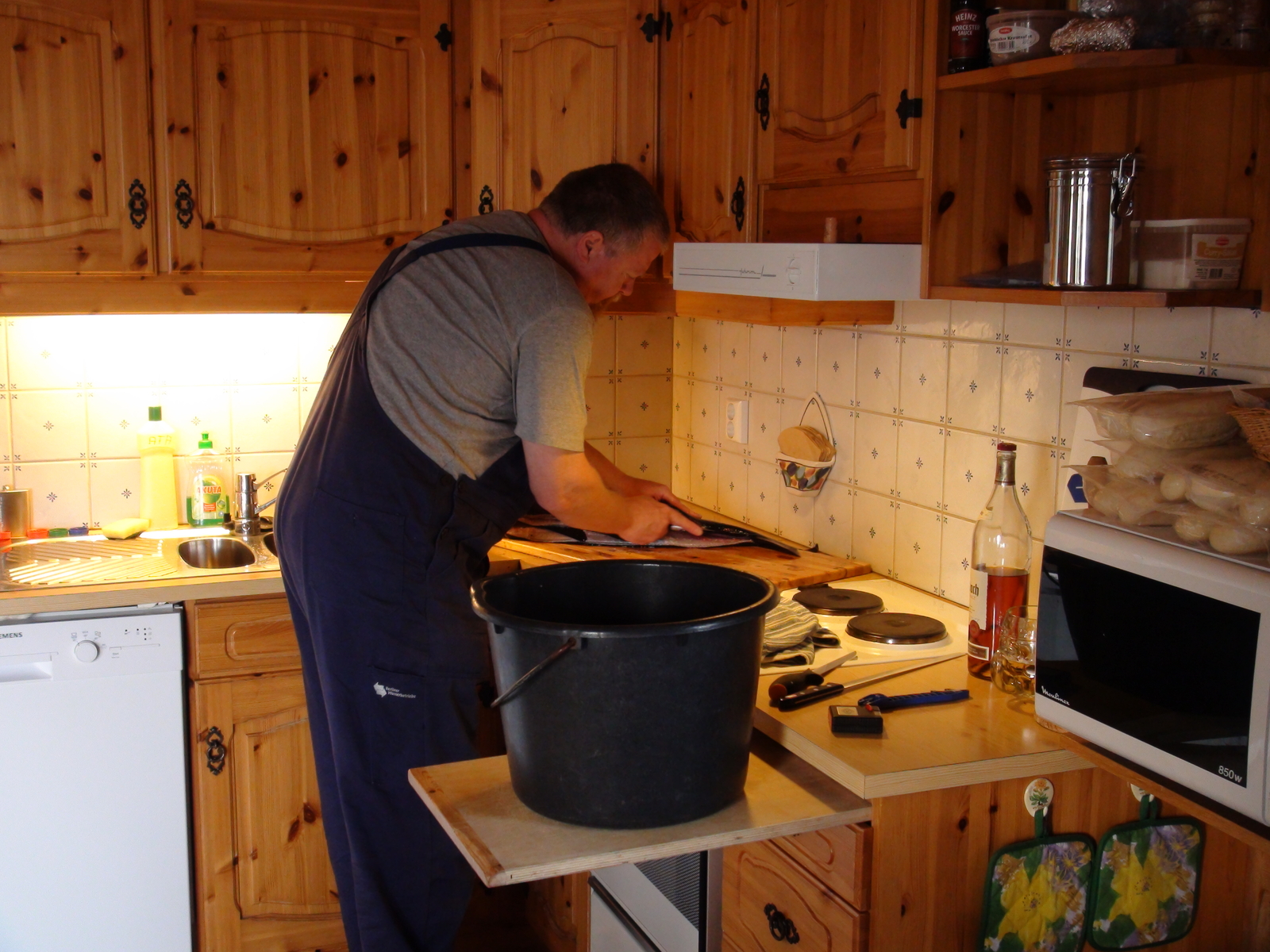 Anfangs ist die Sicht wieder diesig. Gegen Mittag drückt sich die Sonne durch und brennt wie im Hochsommer. Es ist etwas windig und es ist zu heiß in der Sonne, um angeln zu fahren, da kriegt man ja einen stich in der Sonne. Also haben wir schon mal unser Abendessen vorbereitet und den Kasseler angebraten.