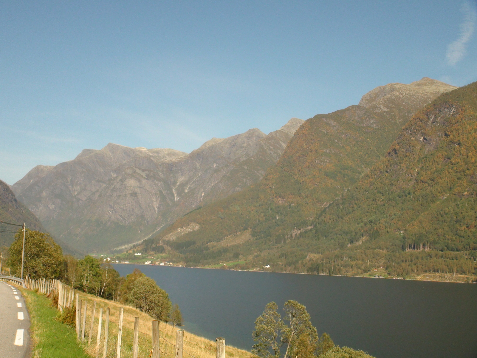 Die Felswände sehen ganz anders aus, als mit den dicken Wolken im Regenwetter. An den Felshängen sieht es schon teilweise sehr herbstlich aus, wirkt traumhaft schön bei diesem tollen Wetter. Es ist immer wieder großartig, den Svære-und Vetlefjord mit seinen gewaltigen Bergen entlangzufahren.