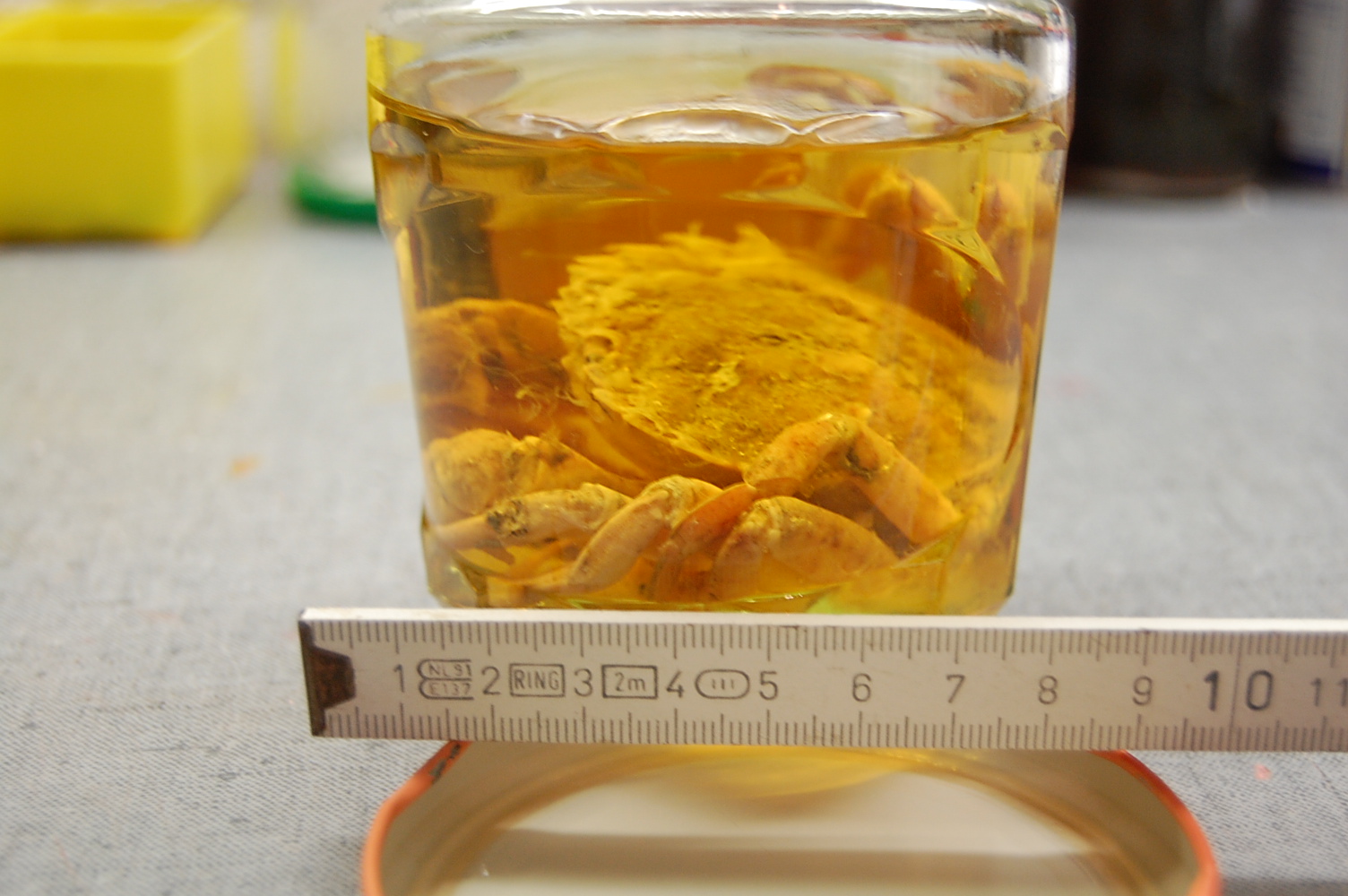 Wie ich gehofft hatte, ein Dorsch hat mir eine wunderschöne Krabbe ausgespuckt, auch die richtige Größe. Leider bekomme ich kein Formalin zum Einlegen, jetzt versuche ich es mit Spiritus, es reicht, wenn ich nur einen Abguss davon erhalte und mir die Form davon bauen kann.