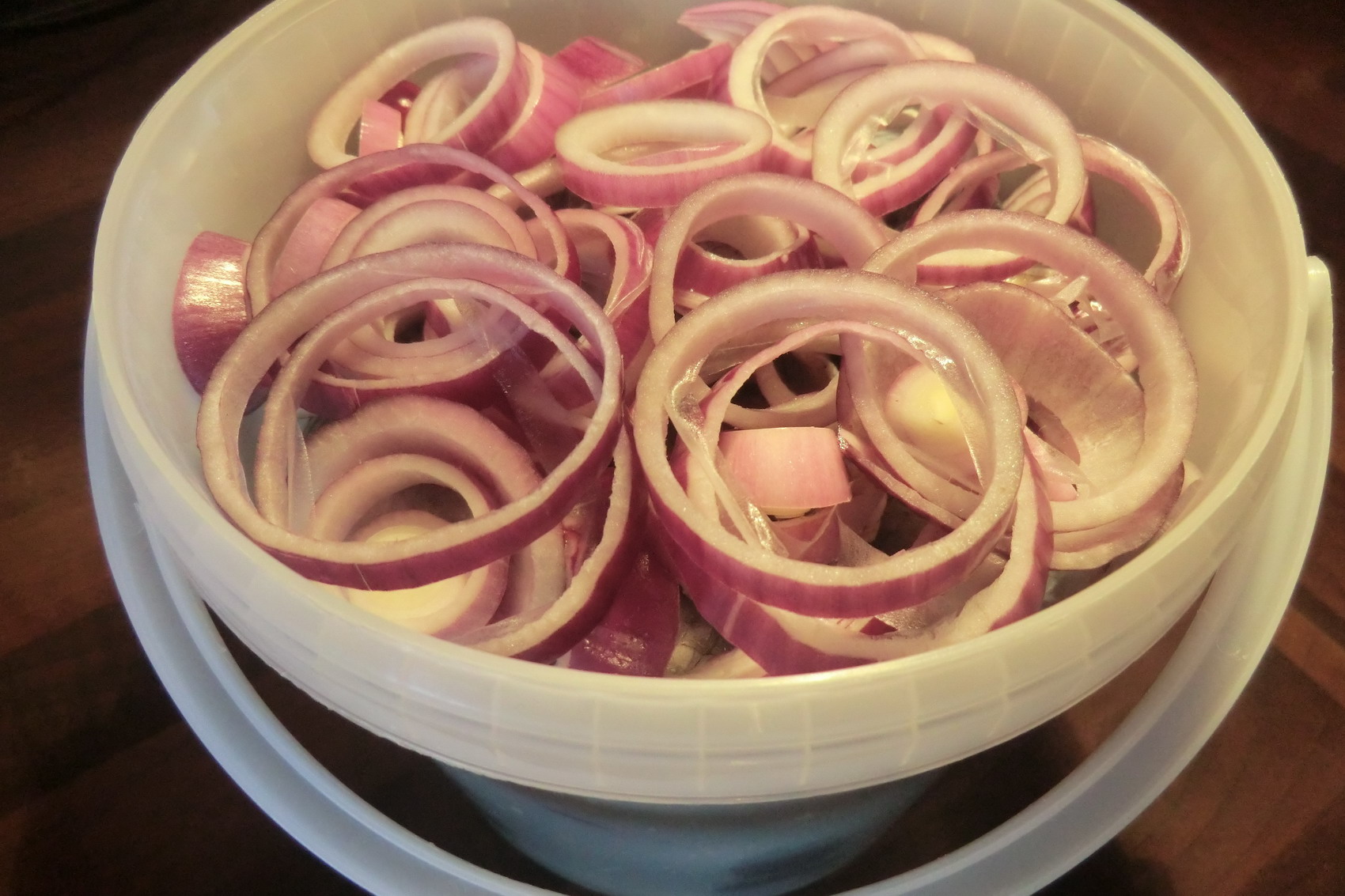 - in Gläsern schichten, Zwiebelringe zugeben und mit dem Sud bedecken