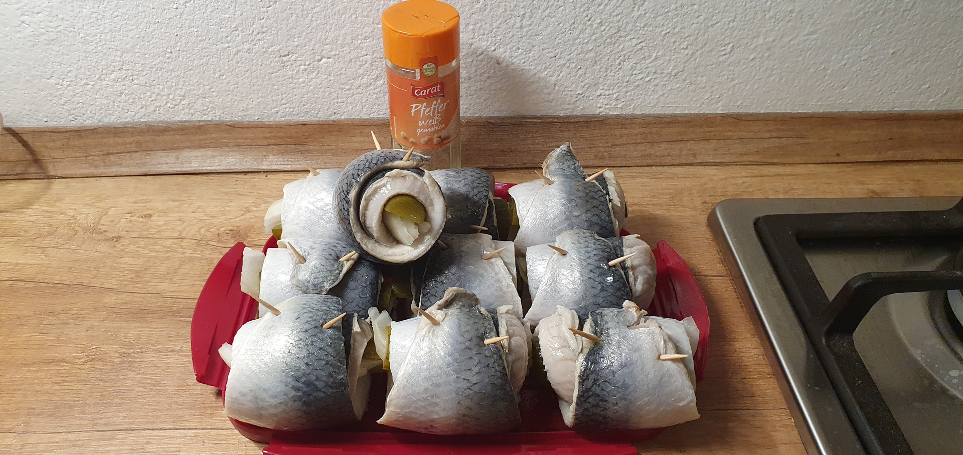 - die Heringsfilets abspülen, abtrocknen und mit Gurke und Zwiebel wickeln und mit 1 - 2 Zahnstochern fixieren