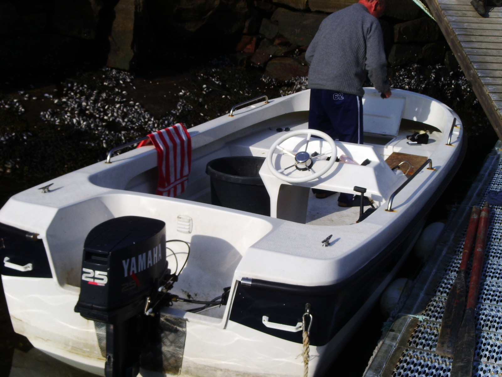 Der Bootssteg ist gut und mit Gitterrosten ausgelegt. Passt sich der Tide an. Am Ende des Stegs steht der Filitiertisch. Allerdings ohne fließendes Wasser. Im Normalfall stehen zwei Boote am Steg. Ein weißes Boot mit 25 PS-Motor und ein orangefarbenes Boot mit 20 PS.