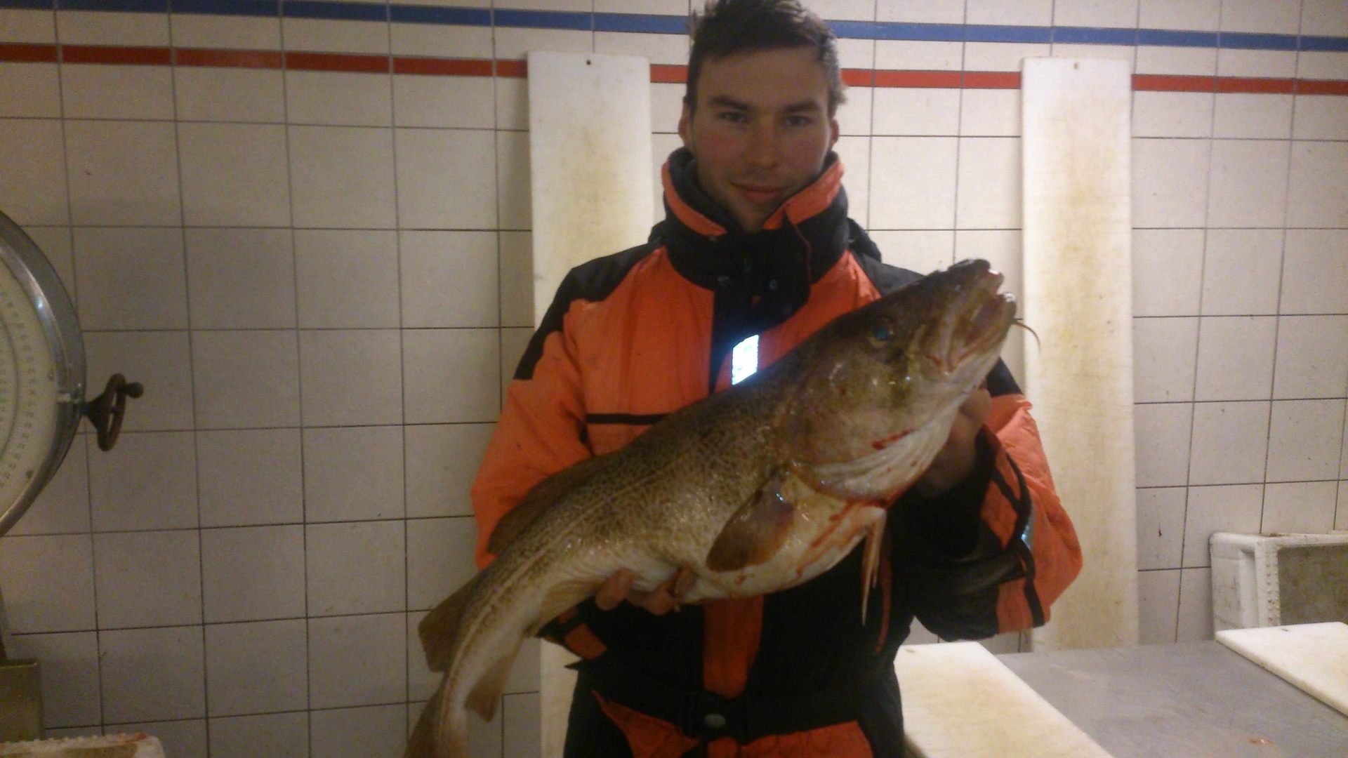 Wir haben eine Traumdrift erwischt und alle vier Ruten waren zeitgleich krumm. Alle Ruten mit Fischen waren am Deck, doch einer machte noch dicke Backen. Der Totty pumpte den bis dahin größten Fisch seines Lebens.Nach ca. 10 min für uns und einer Ewigkeit für Totty landete er den von 1,02m langen und 12kg schweren Dorsch mit aufgebogenen Drilling auf Deck.