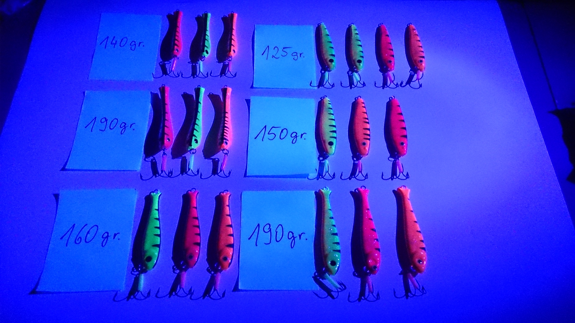 Bei allen Pilkern ist die Form selbst gebaut, Pilker sind also selbst gegossen. Dann wurde eine Schicht Pulverlack eingebrannt, danach mit einer Aibrushpistolle das Design lackiert und im Anschluß noch 3 Lackierungen mit 2K Parkettlack versiegelt.