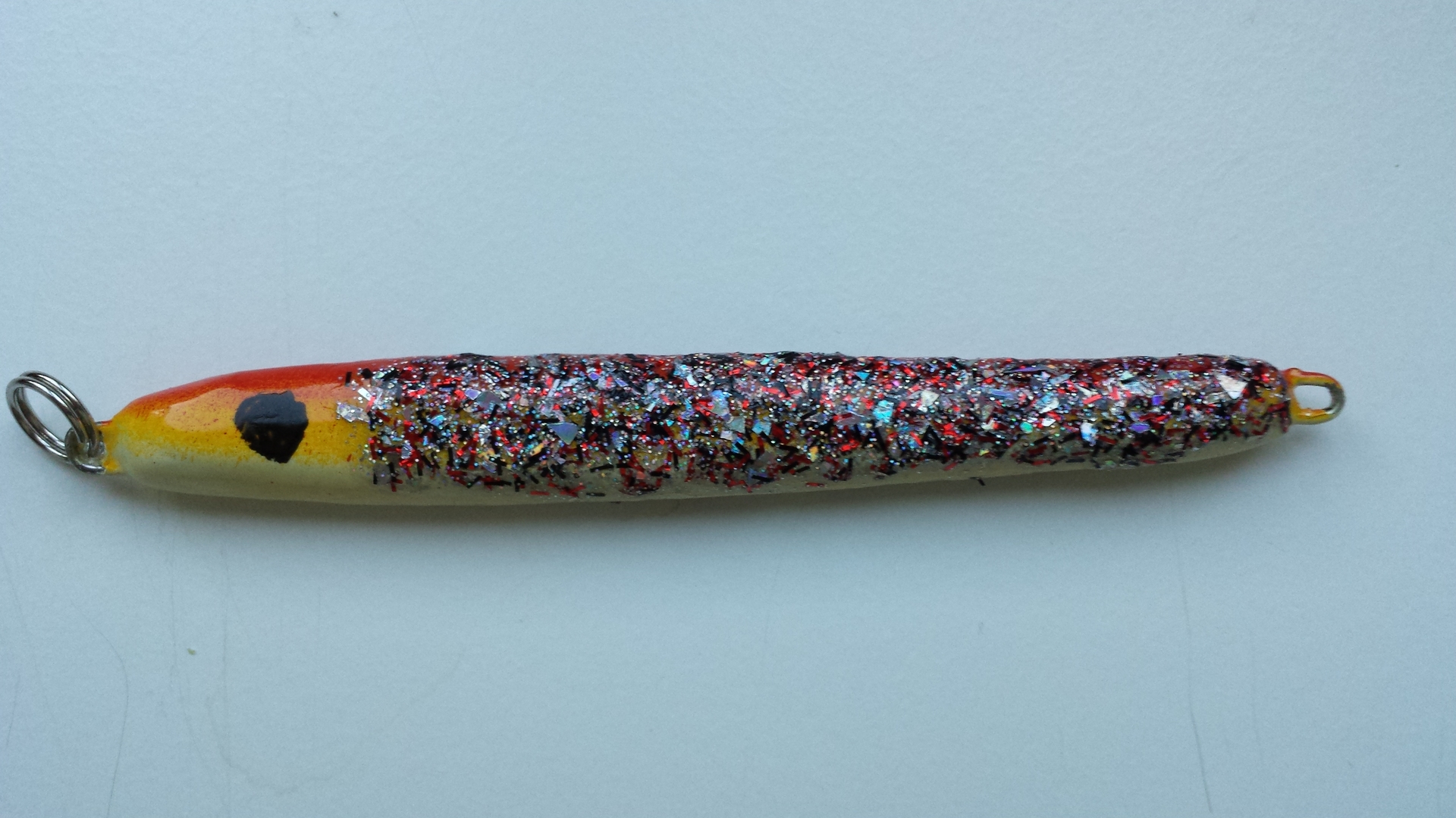 Pilker 150g, Pulverlack und dann Goldglitter aufgestreut und ebenfalls 2x mit Parkettlack versiegelt. Form selber gebaut.