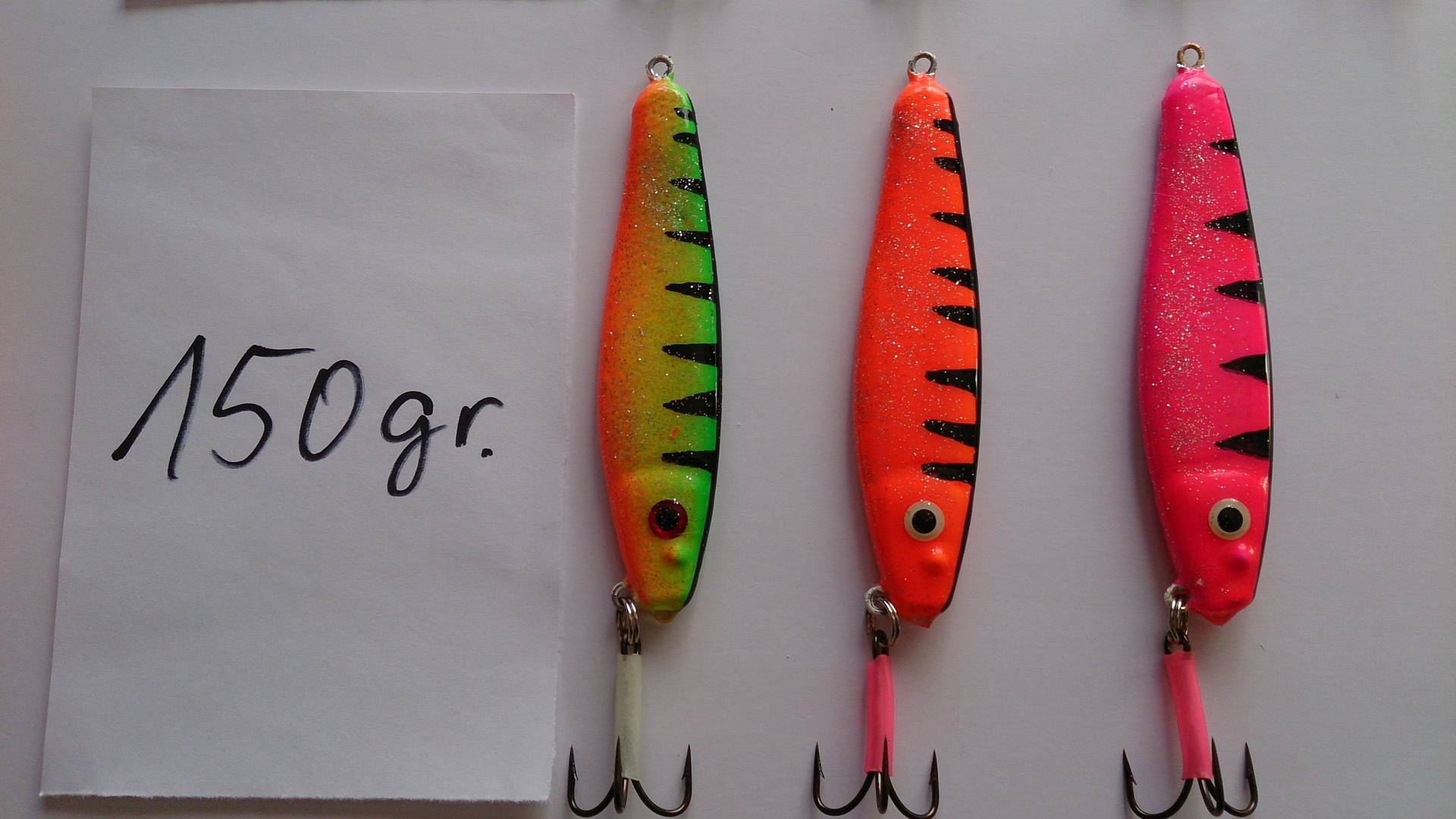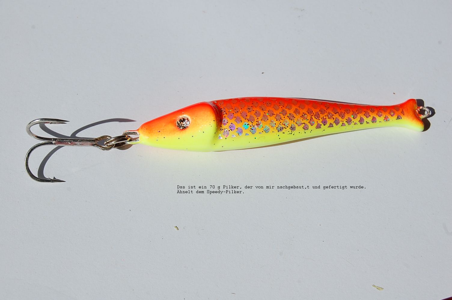 Bei allen Pilkern ist die Form selbst gebaut, Pilker sind also selbst gegossen. Dann wurde eine Schicht Pulverlack eingebrannt, danach mit einer Aibrushpistolle das Design lackiert und im Anschluß noch 3 Lackierungen mit 2K Parkettlack versiegelt.