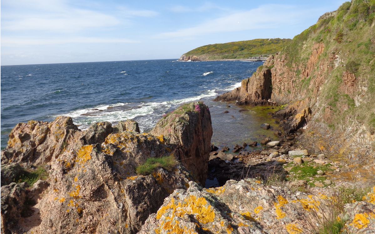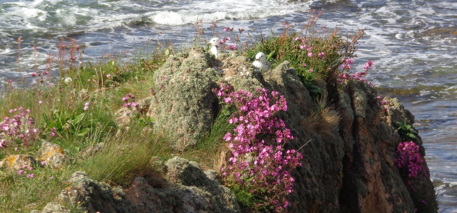 hier ein kleiner vorgeschmack. brütende möwen, granitsteilküste und die ruine von hammerhus aus der ferne.