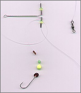 2 Meter vorfach mit grundblei davor ein einfach haken mit 25 cm gummifisch dran.