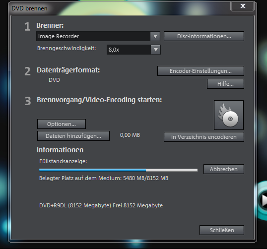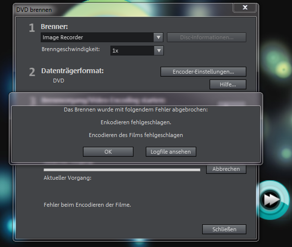 Wenn es das Encoden ggf. durch eine fehlerhaften Eintrag ist, wird das Brennen mit dem Recorder aussteigen oder das Ergebnis ist so groß das es auf keine DVD passt.