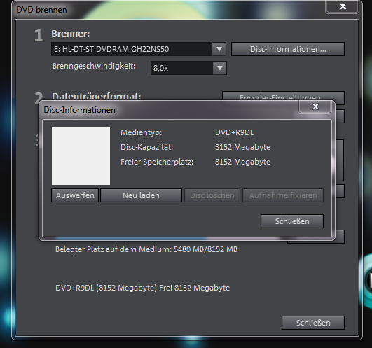 However, wenn es passt gut. Sonst meine vorangegangenen Tipps aufnehmen. Ob die DVD erkannt wird kannst du daran erkennen, ob sinnvolle Einträge unter dem Button "Diskinformationen" auftauchen. Wenn nicht, nutzt du einen kaputten Rohling, oder ein hinterindischer Hersteller hat kunstfertig Makrolon auf seinem Brotbrett in den Ofen geschoben. Das wäre also die Stelle wo Qualität was bringt, auch bei der dauerhaltbakeit der DVD.