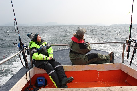 Leider war kein Fisch da und das Wetter wurde von Stunde zu Stunde schlechter. Das hat aber die Stimmung keineswegs getrübt. Wir saßen im Regen und haben unseren Kaffeeklatsch im Freien, auf dem Boot natürlich, gehalten. Wir haben uns leider oftmals selber geangelt und haben viel Zeit mit dem Auseinanderfitzen verbracht. Das klappt morgen bestimmt schon besser. Aber das absolute Beste, wir haben heute Wale gesehen. Absolut krass und das war es allemal wert.