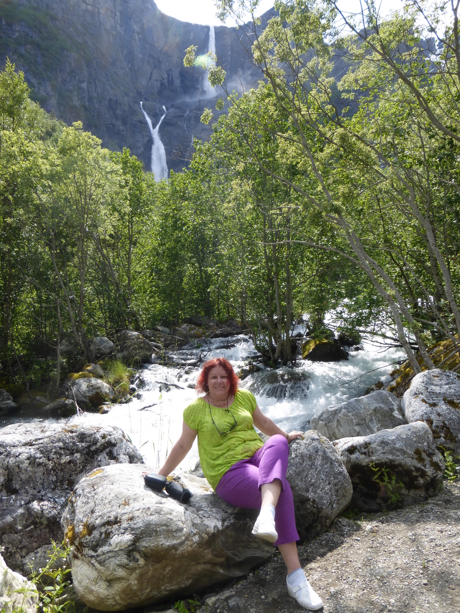 Wenn man durch das Eikesdal fähr, hat man den Mardalsfossen schon vom weiten im Blick. Eine kleine abbiegende Mautstraße führt dann unterhalb des Wasserfalls zu einem Parkplatz mit Shop. Eine halbe bis dreiviertel Stunde Fußweg schließen sich an in Begleitung der tosenden Geräusche des zu tale schießenden Flußlaufes. Der Weg ist begradigt und gut befestigt, das war bei unseren letzten Besuch 2007 noch gaaaanz anders. Damals haben wir hier nur einen Trampelpfad über Stock und Stein vorgefunden.
