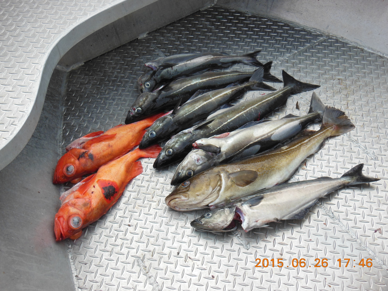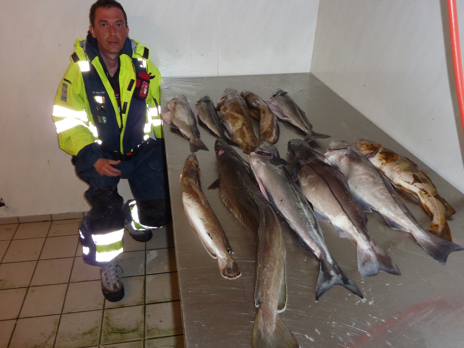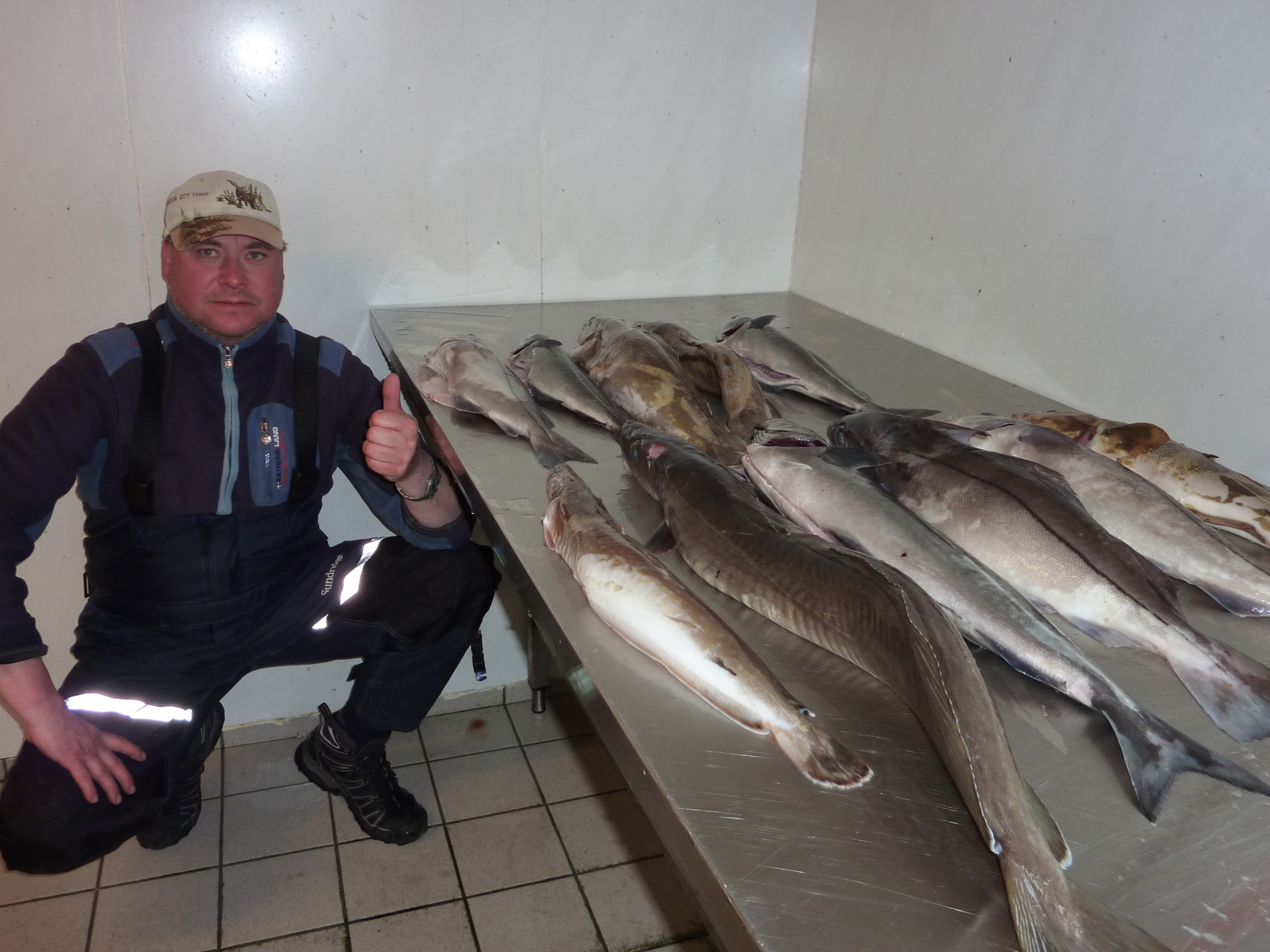 Freitag: Käffchen, Frühstück und Start 6 Uhr auf´s Plateau! Es nieselt ein bissel, hoffentlich wird es noch besser. Die Wellen waren schon ganz schön, die Ausfahrt bis auf´s Plateau dauerte dann fast 2 Stunden. Hier haben wir uns dann bei Wind, Welle und Regen ganze 11 Stunden aufgehalten. Der Start war jetzt etwas ruhiger, Grassi hat dann ne nette Stelle für Köhler auf dem Echo und da ließen wir dann mal die Routen ab. Schöne Köhler, ein Dorsch, ein Schellfisch, ein Pollak und auf der Tour Richtung Heimathafen ein Abstecher zum Fang von Rotbarschen, konnten wir auch hier ein paar schöne ins Boot holen. Zur Freude der Jungs, ich mag die nicht so. Für mich müssen auch Fische gut aussehen und nicht solch hässliche Glubschaugen haben.