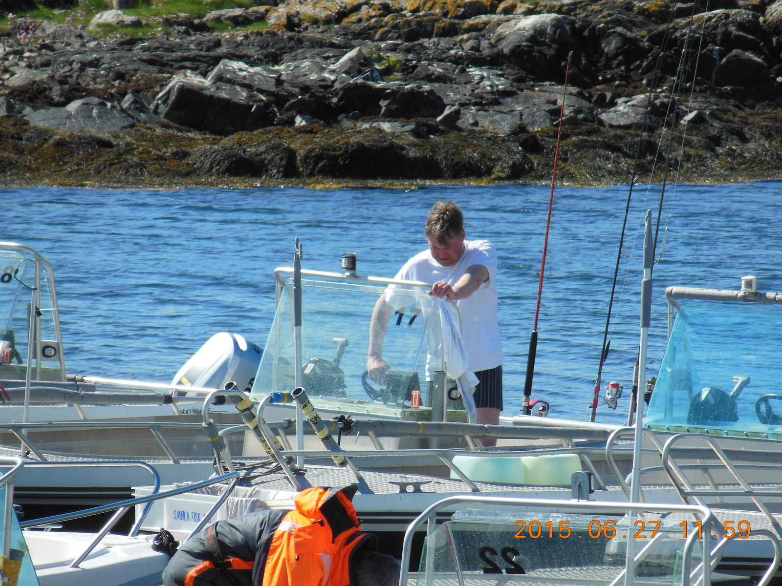 Nach dem Frühstück mal den Wetterbericht checken und feststellen, dass es bestimmt super wäre, bei der Hitze (ohne Wind) eine Ausfahrt auf´s Wasser zu starten. Also ab zum Boot, alles aufräumen und sichten, wieder bissel umräumen, da man ja dann langsam weiß welche Pilker und Beifänger diese Saison am fängigsten sind. Ela sitzt dabei auf dem Bootssteg in der Sonne und Olli kümmert sich um das Angelzubehör. Als auch das erledigt ist, ab zum Haus, umziehen und wieder rauf aufs Boot.