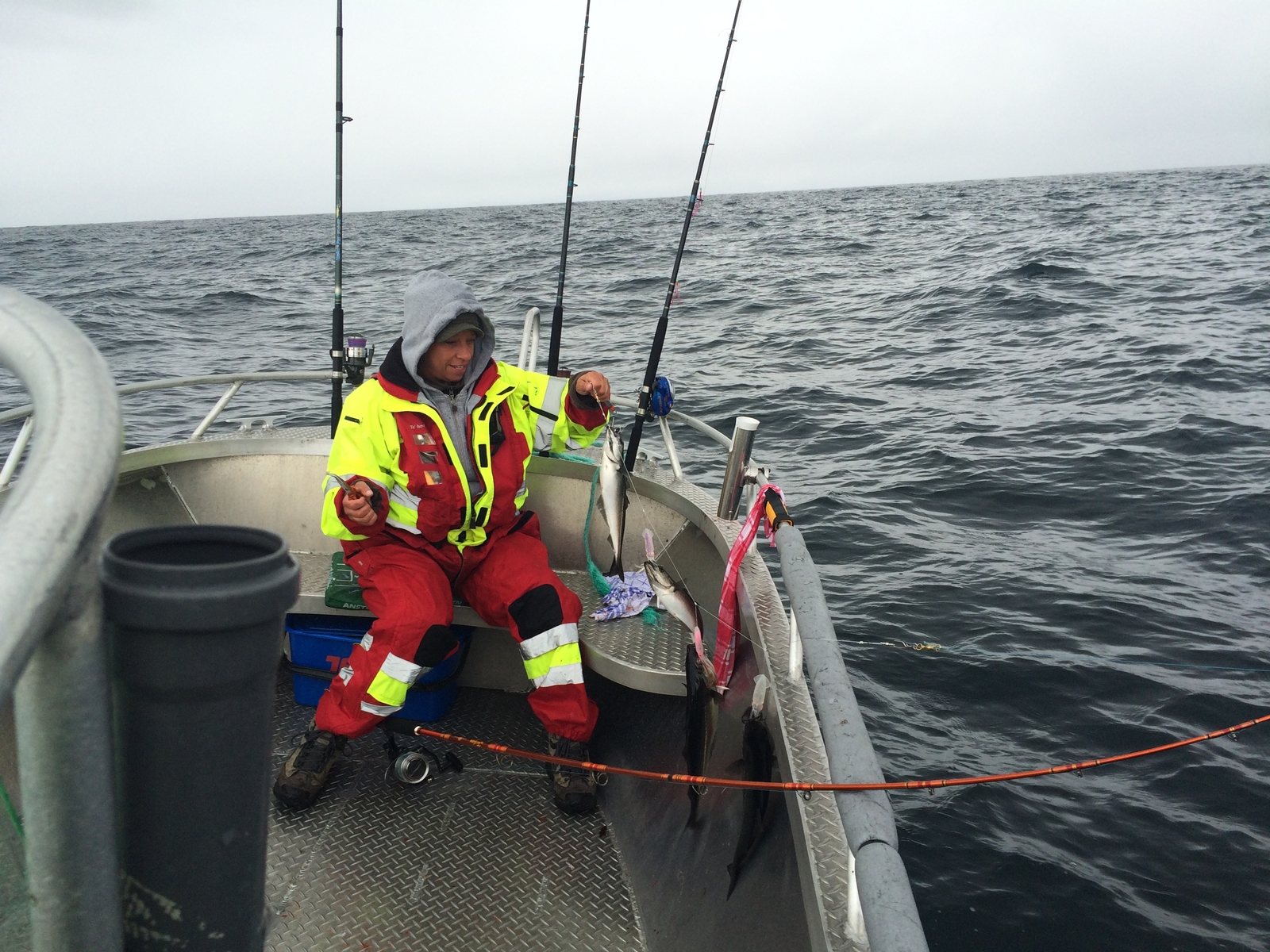 Freitag: Käffchen, Frühstück und Start 6 Uhr auf´s Plateau! Es nieselt ein bissel, hoffentlich wird es noch besser. Die Wellen waren schon ganz schön, die Ausfahrt bis auf´s Plateau dauerte dann fast 2 Stunden. Hier haben wir uns dann bei Wind, Welle und Regen ganze 11 Stunden aufgehalten. Der Start war jetzt etwas ruhiger, Grassi hat dann ne nette Stelle für Köhler auf dem Echo und da ließen wir dann mal die Routen ab. Schöne Köhler, ein Dorsch, ein Schellfisch, ein Pollak und auf der Tour Richtung Heimathafen ein Abstecher zum Fang von Rotbarschen, konnten wir auch hier ein paar schöne ins Boot holen. Zur Freude der Jungs, ich mag die nicht so. Für mich müssen auch Fische gut aussehen und nicht solch hässliche Glubschaugen haben. ;)