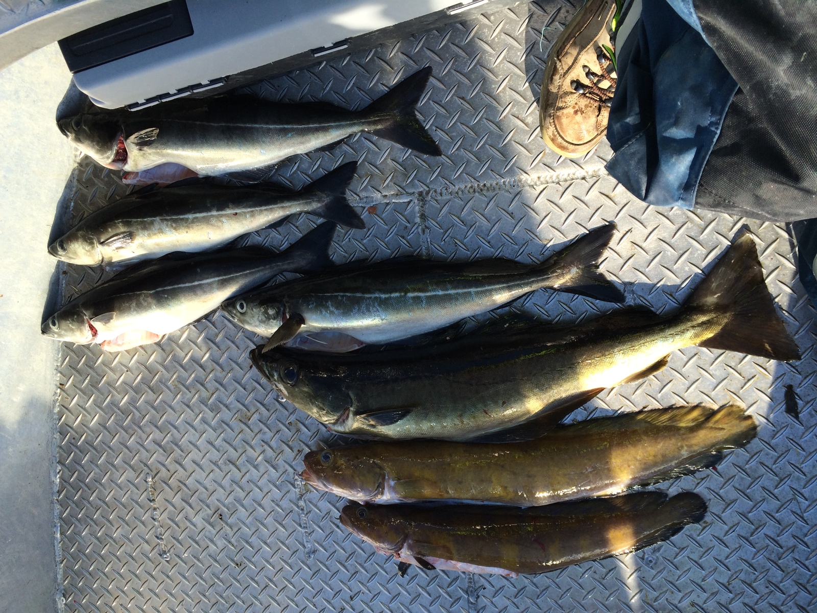 Es war wunderbar, ein laues Lüftchen, glattes Meer, wunderbar um weiter raus zu fahren. Zielfisch der Jungs evtl. Rotbarsche. Es wurden dann richtig schöne Seelachse, wobei wir (Olli & Ela) sich mit ihren Beifängermontagen leider immer wieder ins Gehege kamen. Aber wir haben in der ganzen Zeit draußen auch wieder schön gefangen. Bis Montag 2 Uhr in der Früh, dann war Regen angesagt und wir wollten nach Möglichkeit rechtzeitig in der Anlage sein.