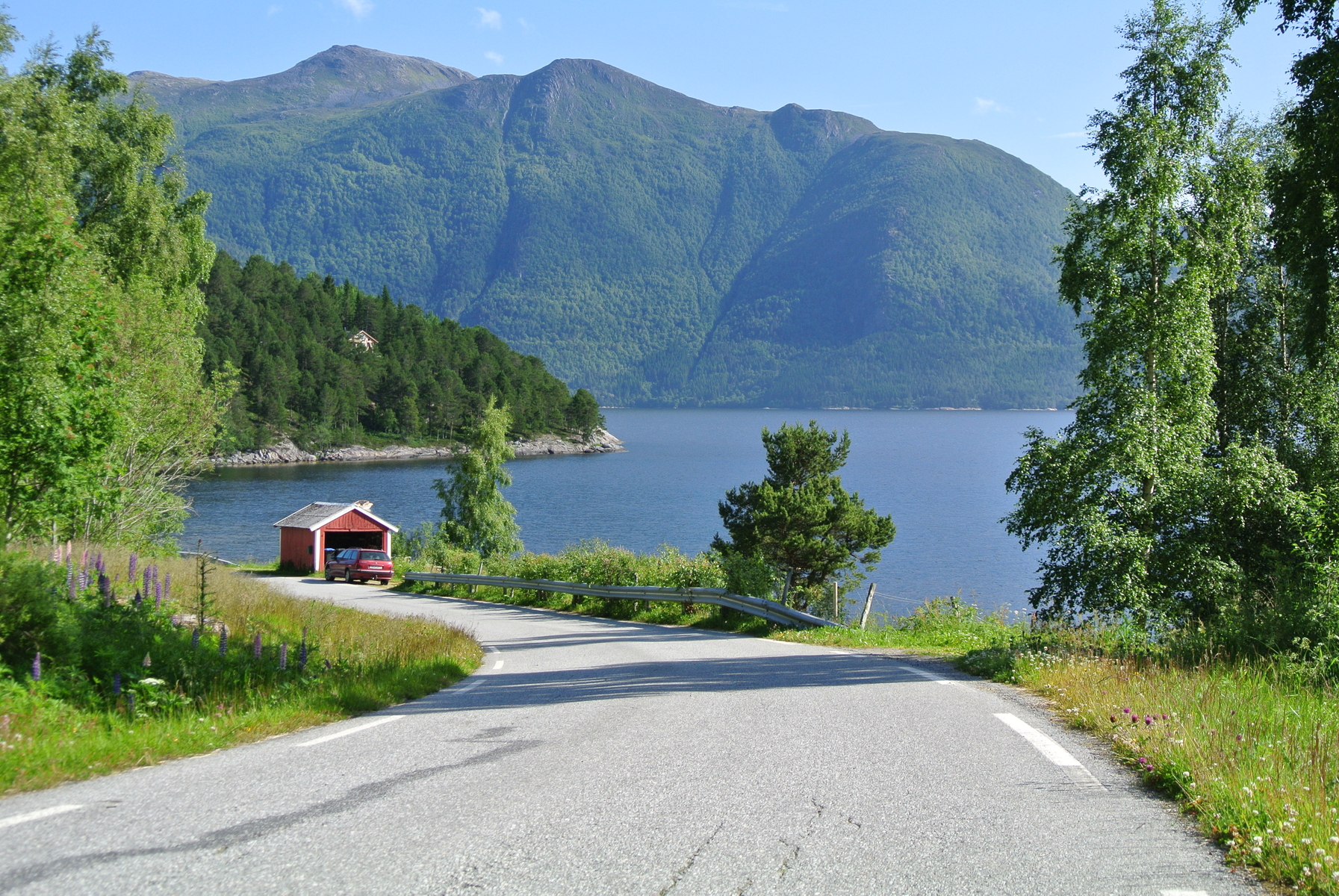 Blick von der Straße auf den Fjord