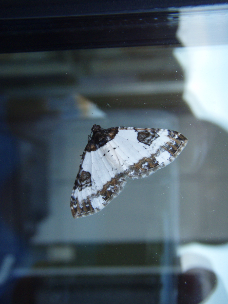 Garten-Blattspanner (Xanthorhoe fluctuata), saß gestern auf einer Glas- Scheibe.....
