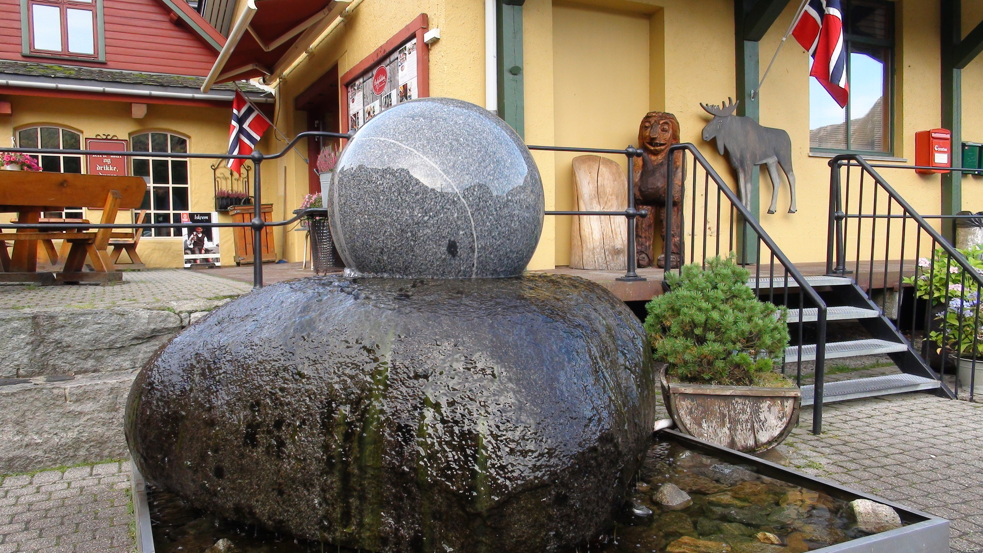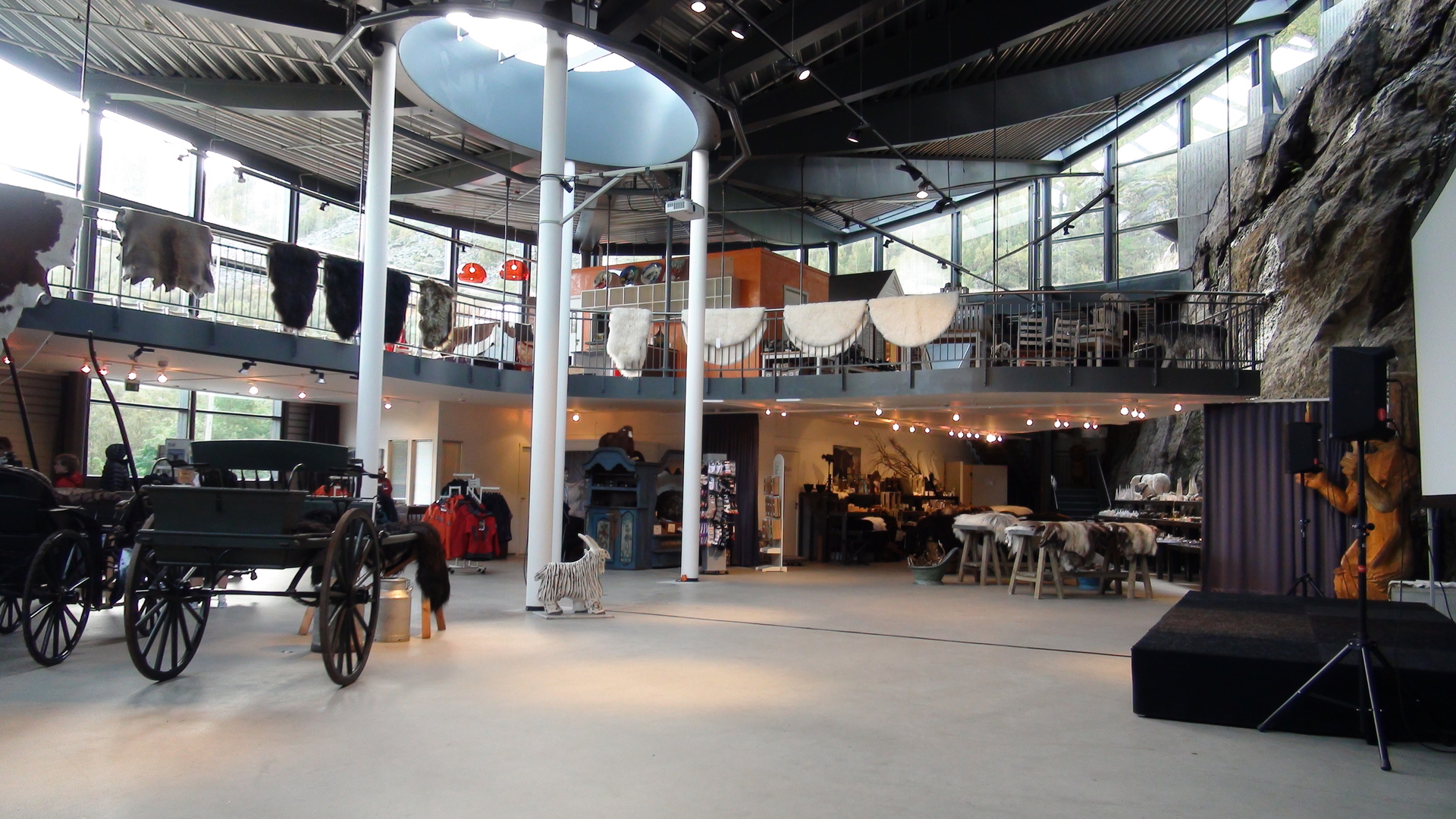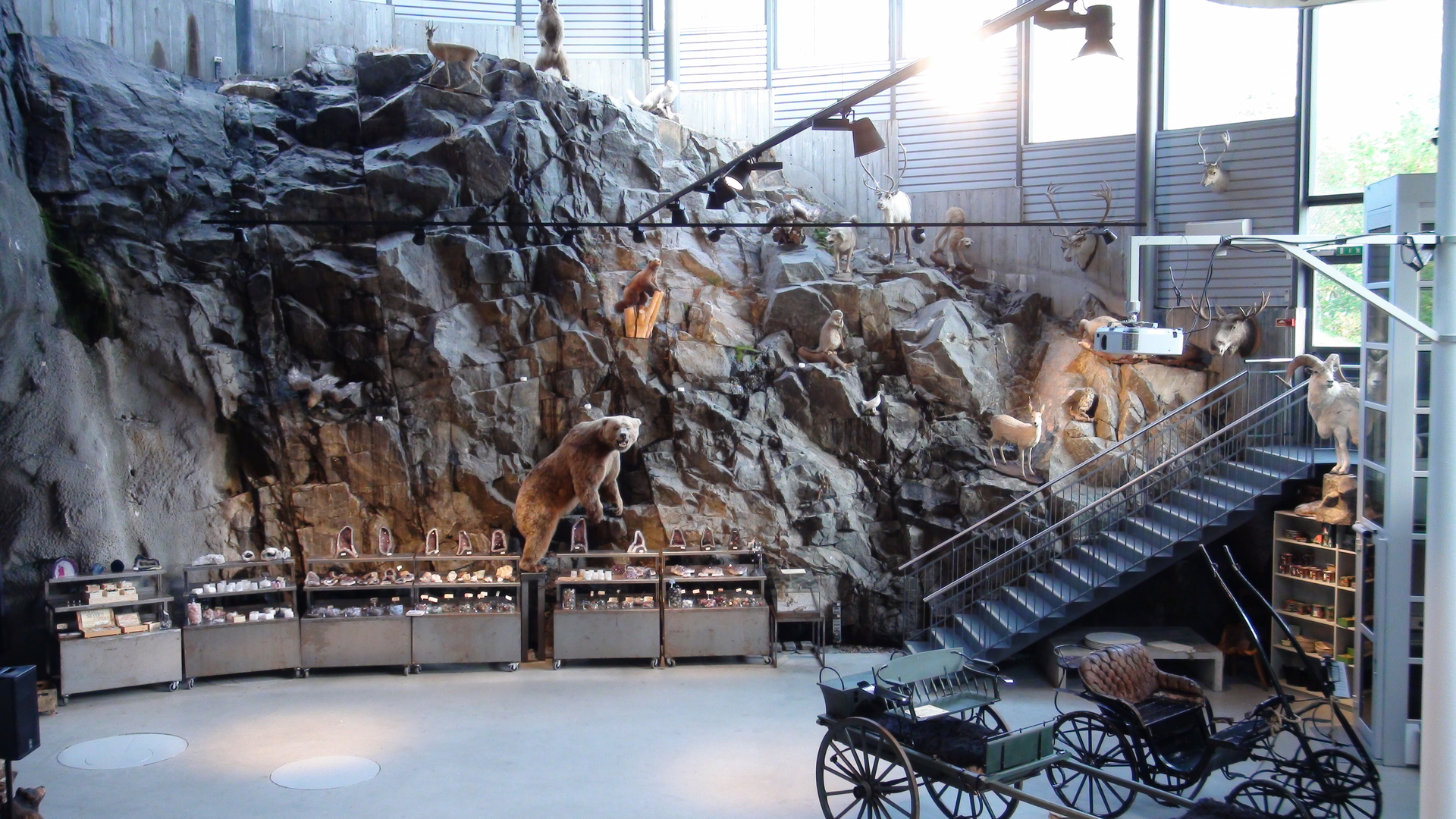 Im hinteren Teil des Byrkjedalstunet offenbart sich die große und helle Berghalle. Sie ist teilweise in den Fels eingebaut worden. Große Klasse!!! Auf den dortigen Felsen stehen einige ausgestopfte Tiere, die in Norwegen beheimatet sind. Ist toll gemacht!!! Ein richtiger Blickfang!!!!