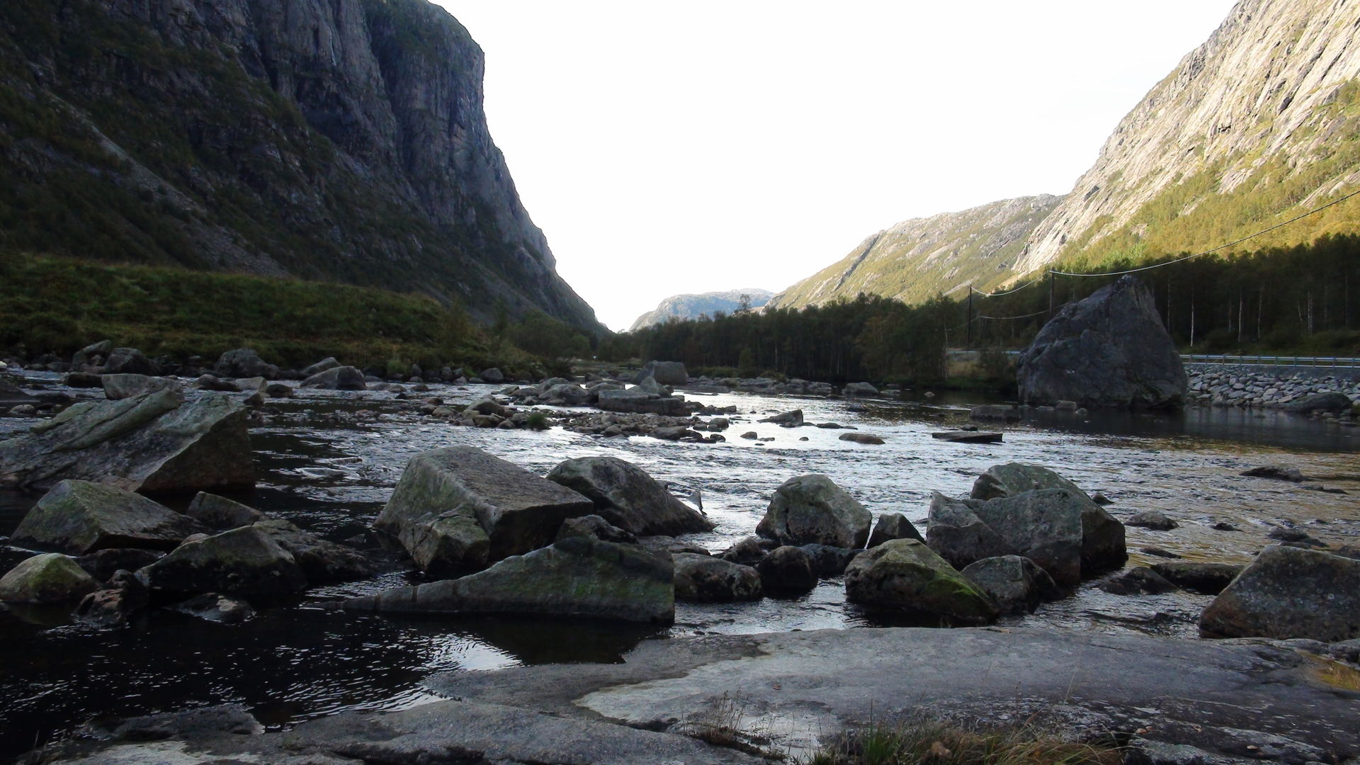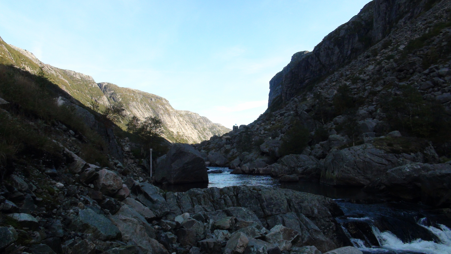 Das Wetter ist toll, ideal für diesen Ausflug. Die Sonne scheint, nur durch diese gewaltigen, hohen Felswände kommen keine Sonnenstrahlen im Tal unten an, dementsprechend kühl ist es hier, zwischen den schattigen Felsen.
