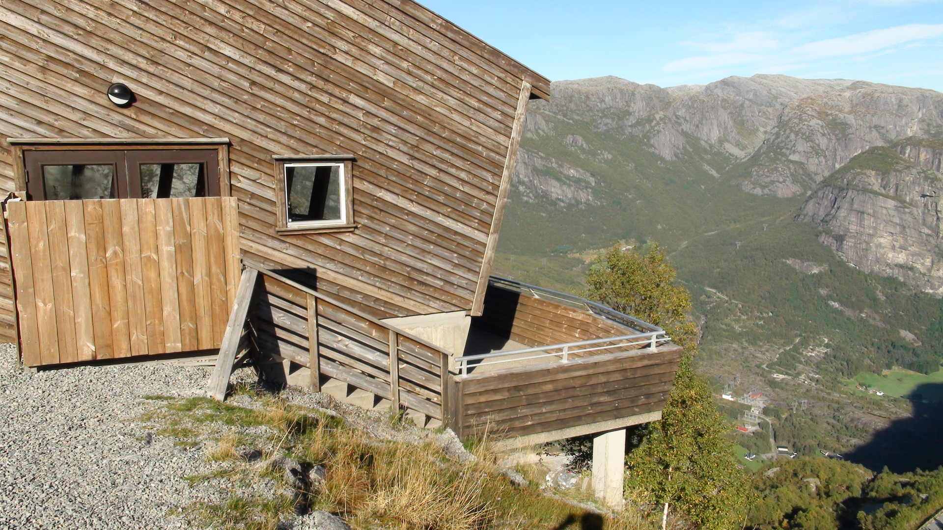 Mit einem Mal, hinter einer der vielen Kurven, erscheint er...wir sehen Øygardsstøl, das Adlernest. Es ist der Aussichtspunkt über den Lysefjord. Dort gibt es u.a. ein Restaurant und einen Souvenirshop und außerdem hat man einen herrlichen Panoramablick auf die 1000m hohen Felswände und auf den Ort Lysbotn, am hintersten Ende des Lysefjordes.