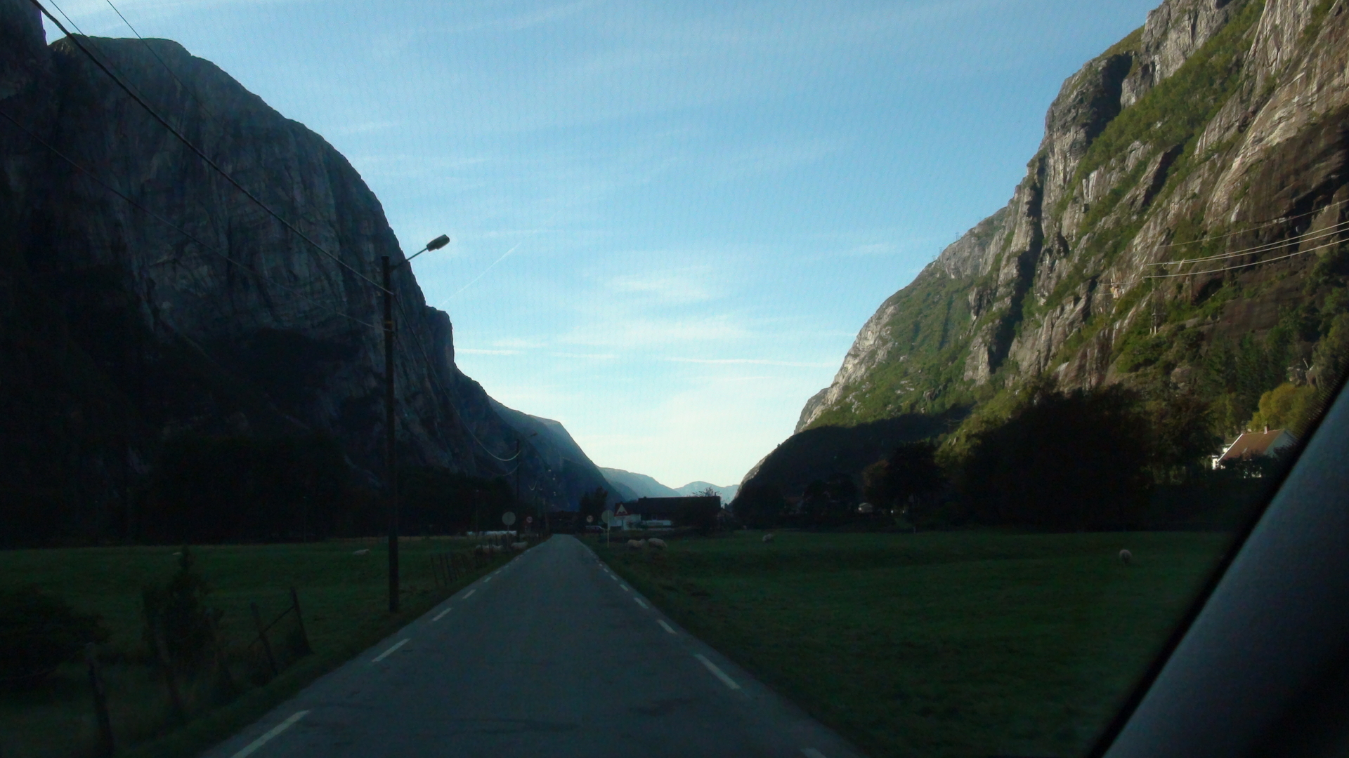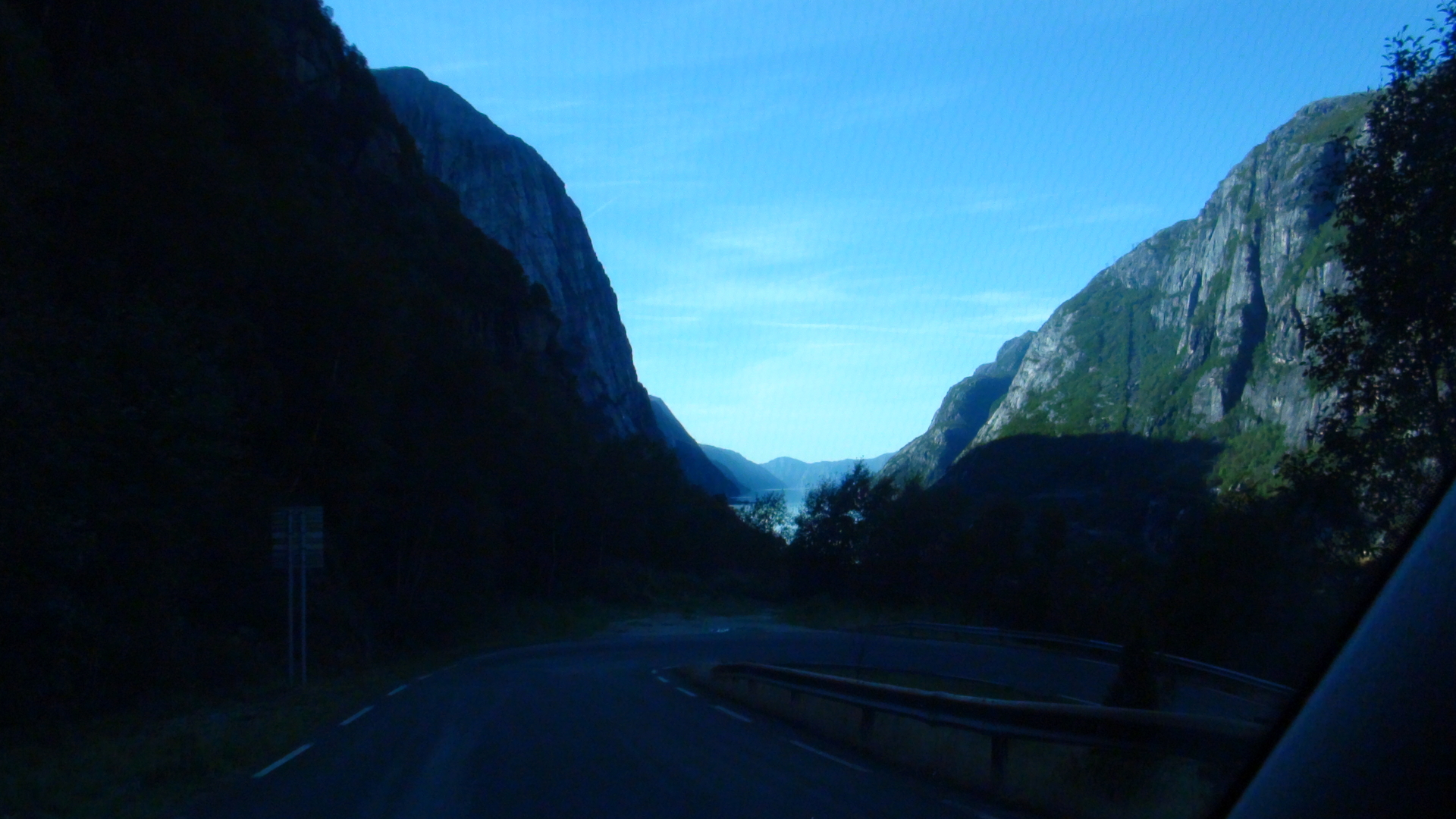 Wir fahren also die 27 Haarnadelkurven hinunter nach Lysbotn. Die Straße ist, wie so üblich in Norwegen, wieder eng. Kurve für Kurve windet sie sich nach unten. Man meint, doch bald unten sein zu müssen.