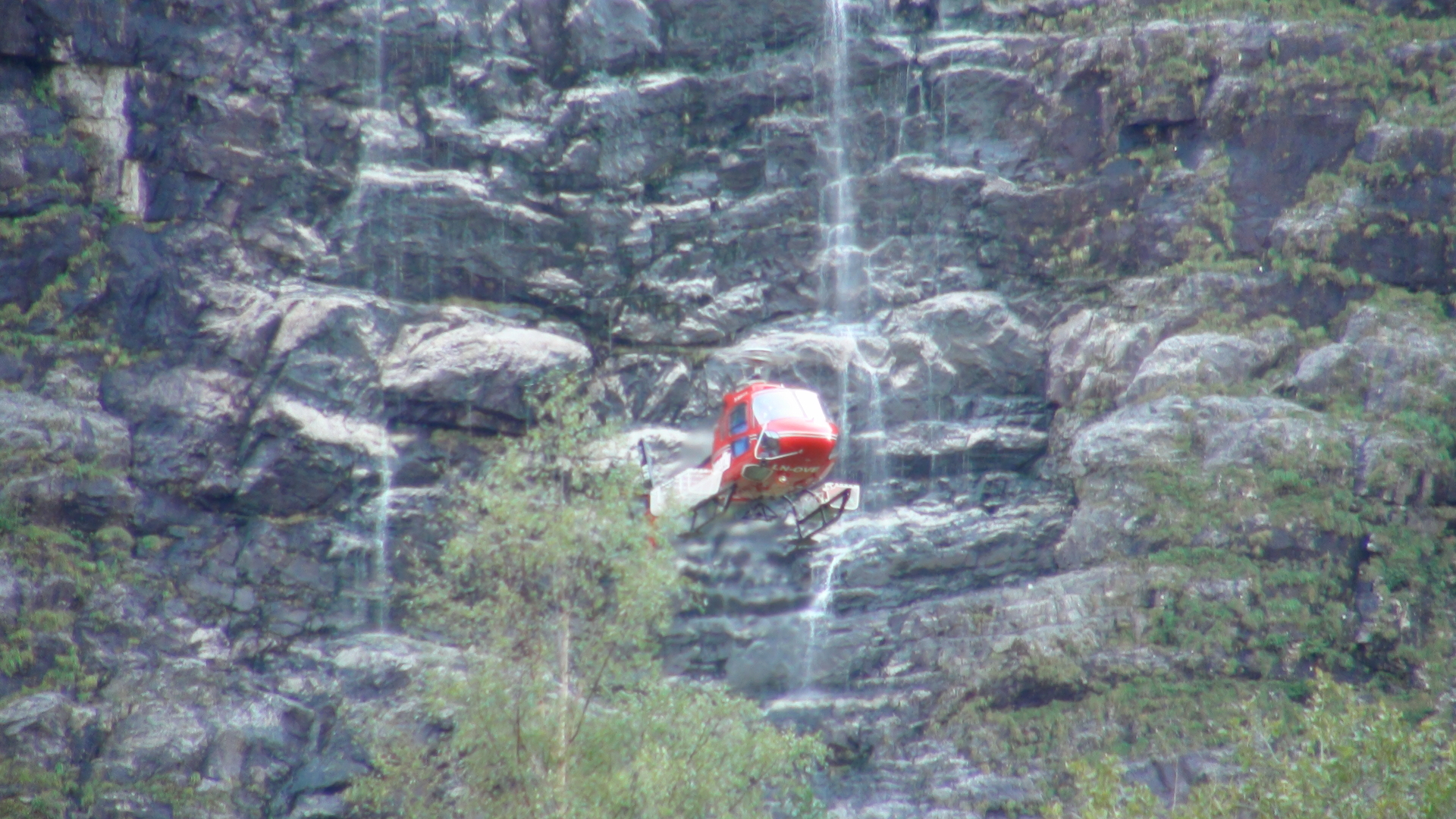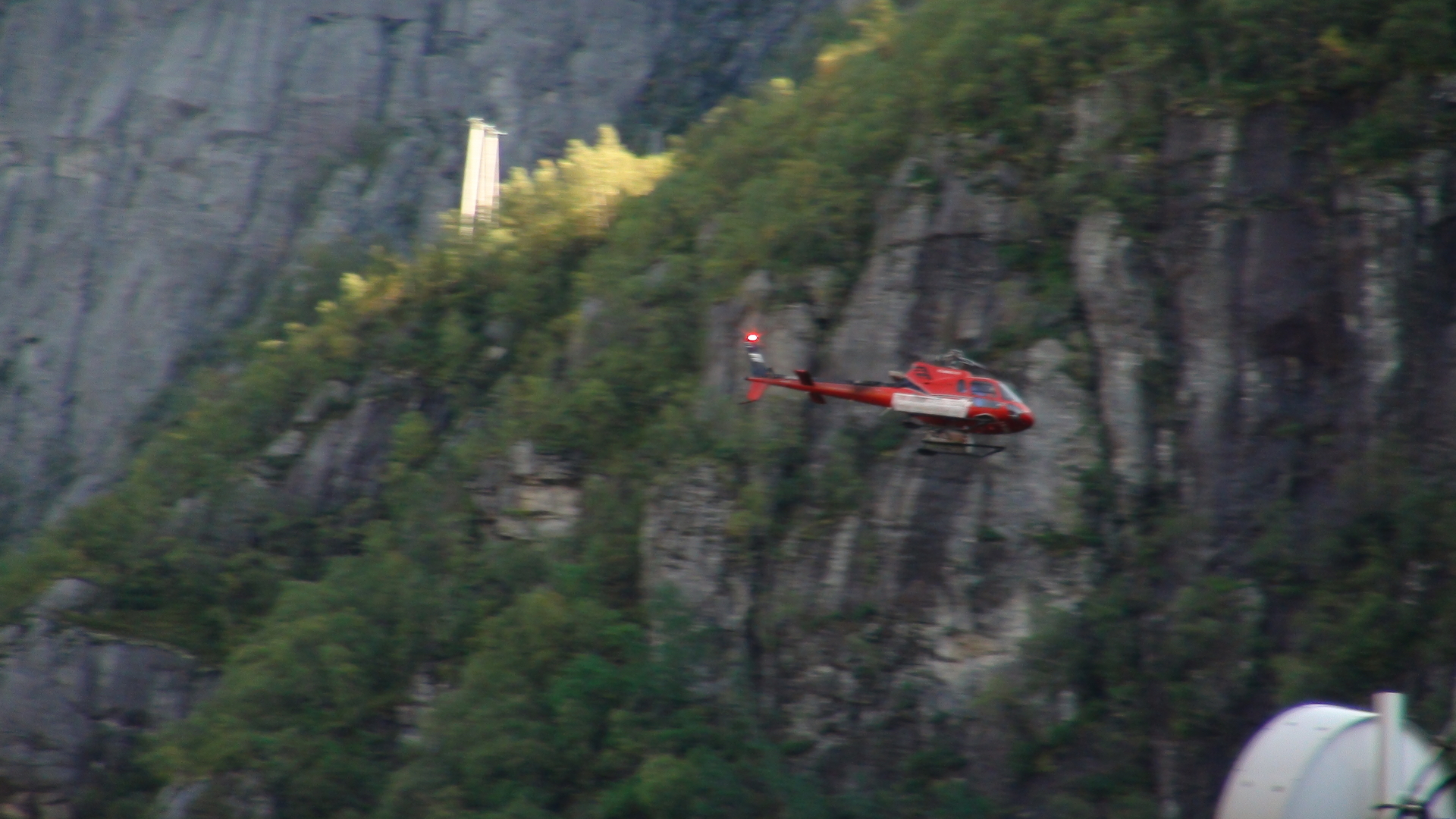 Irgendwann hörten wir das Geräusch eines Hubschraubers. Nach etwas suchen, sahen wir ihn auch. Wie winzig er vor dem Bergmassiv schien!! Wie ein Spielzeugmodell! Er schwenkte ein und landete nicht weit entfernt von uns. So ein Rundflug über den Fjord muss ja traumhaft sein! Dieser Hubschrauber lieferte irgendwelche Materialien an und hob wieder ab.
