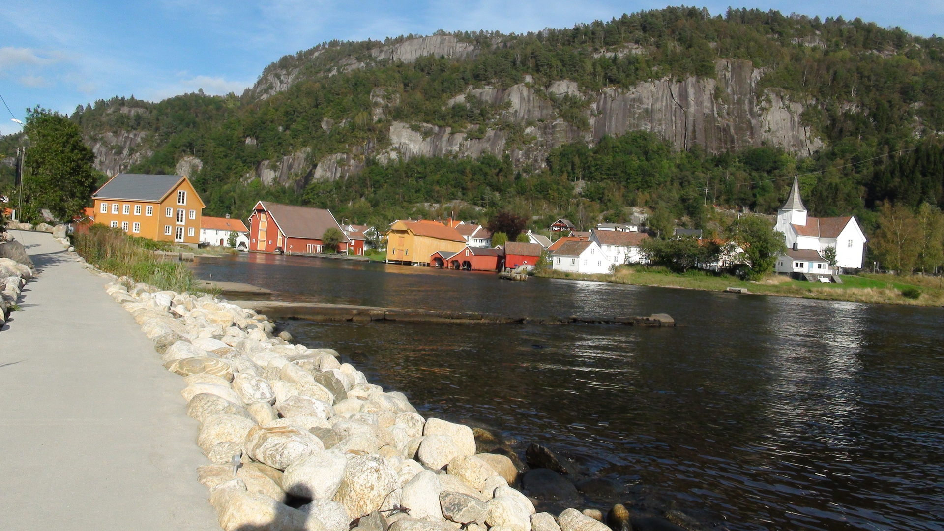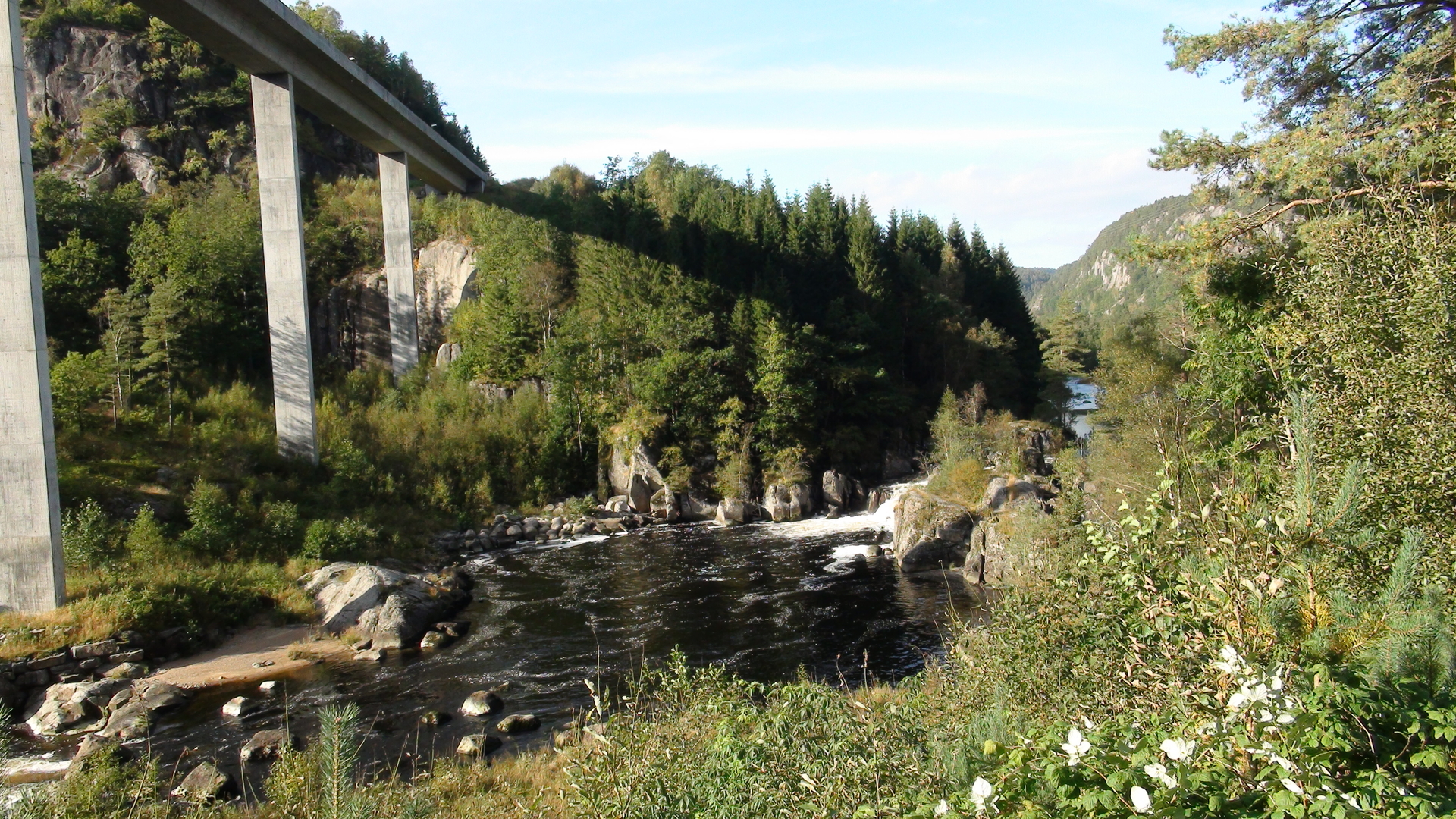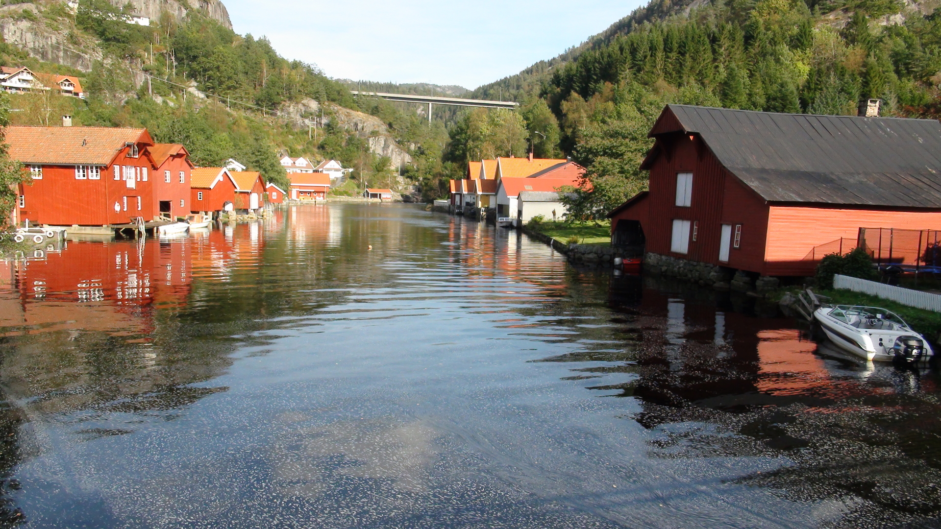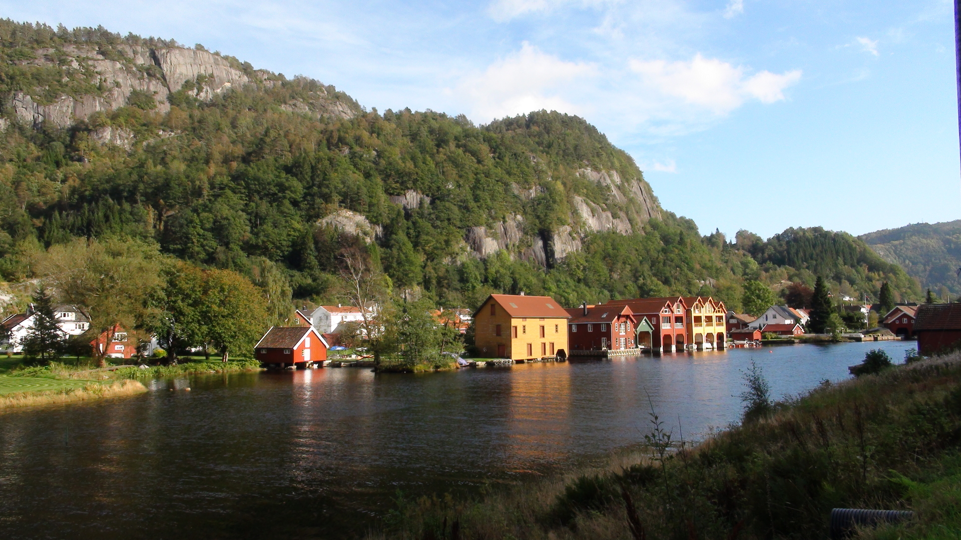 Mitten in Feda gibt es eine kleine Brücke. Von dort hat man einen direkten Blick auf unsere Unterkunft, hoch über dem Feda-Fluß.