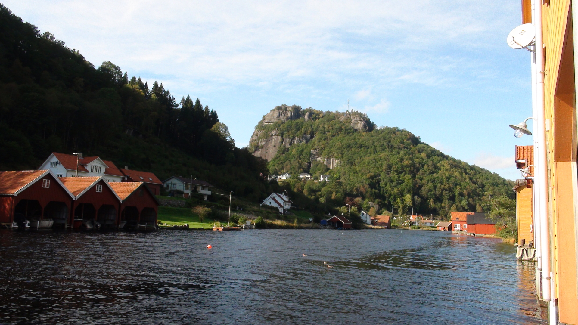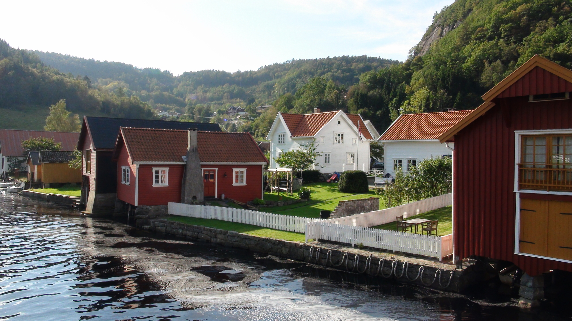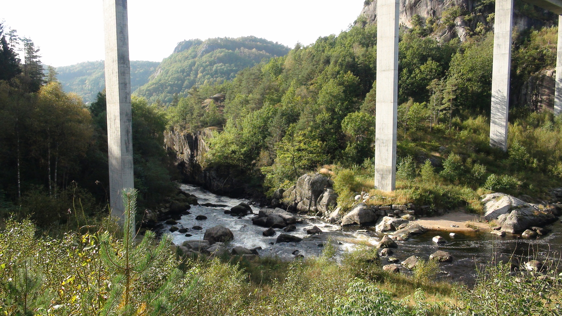 Mitten in Feda gibt es eine kleine Brücke. Von dort hat man einen direkten Blick auf unsere Unterkunft, hoch über dem Feda-Fluß.