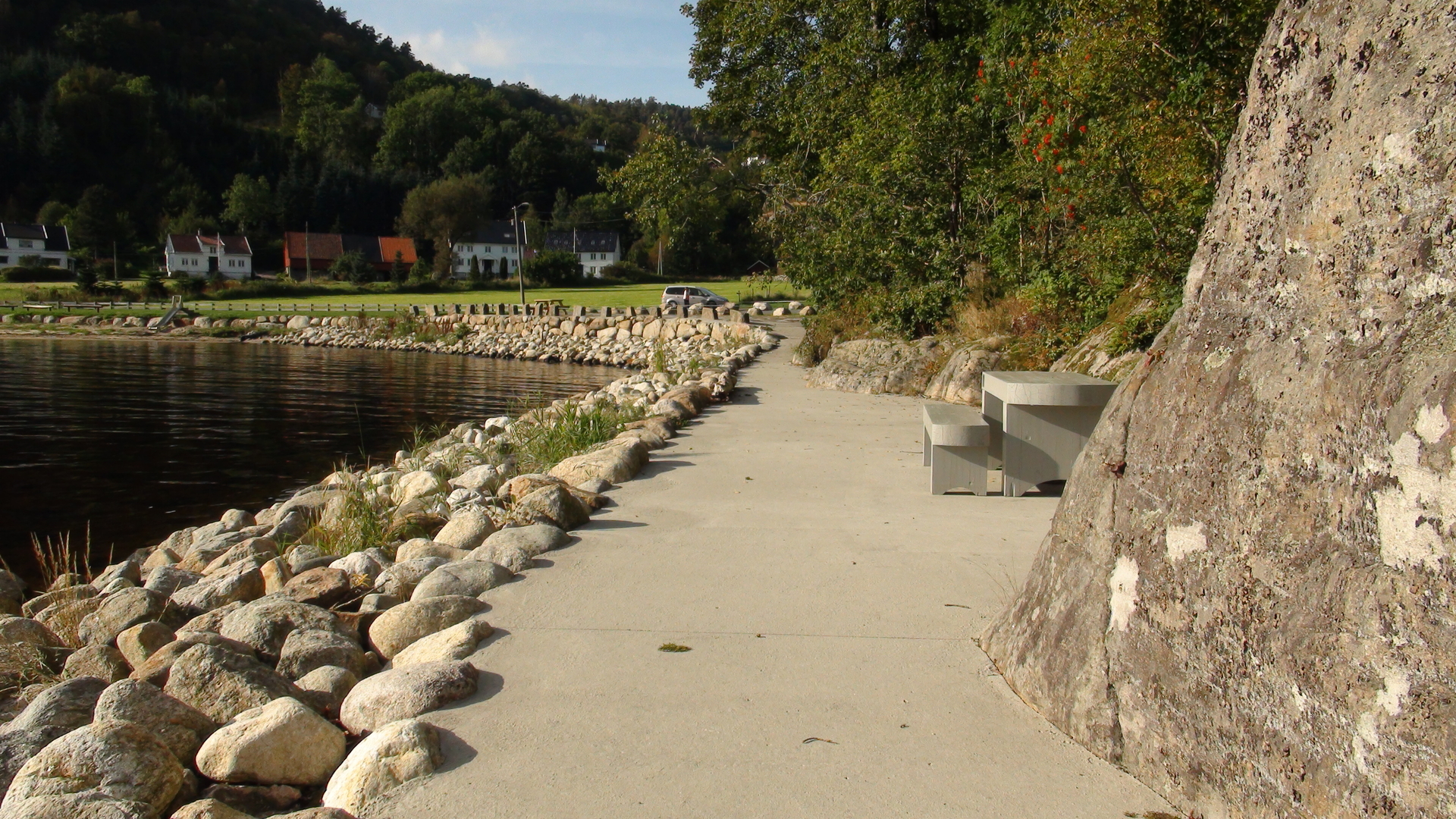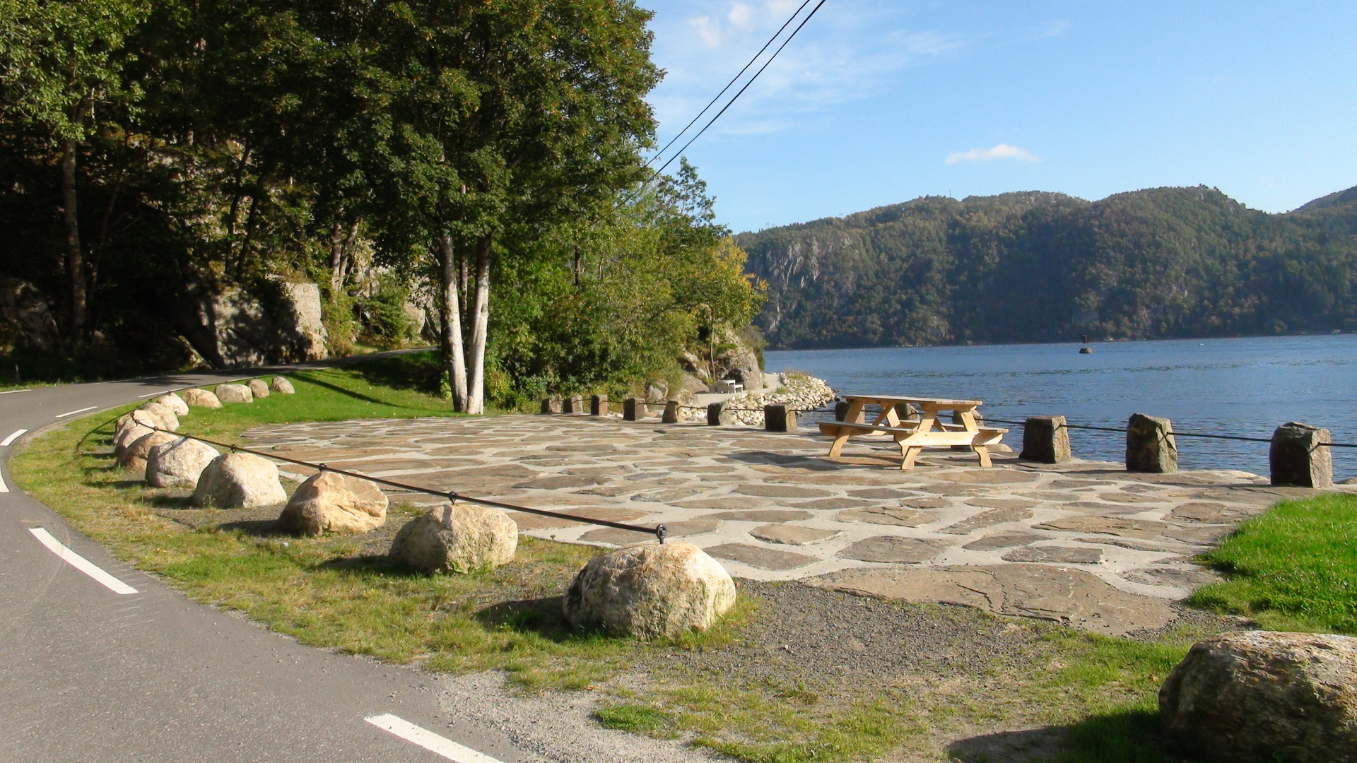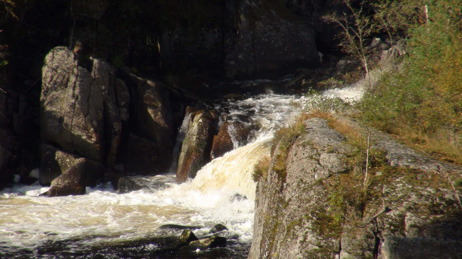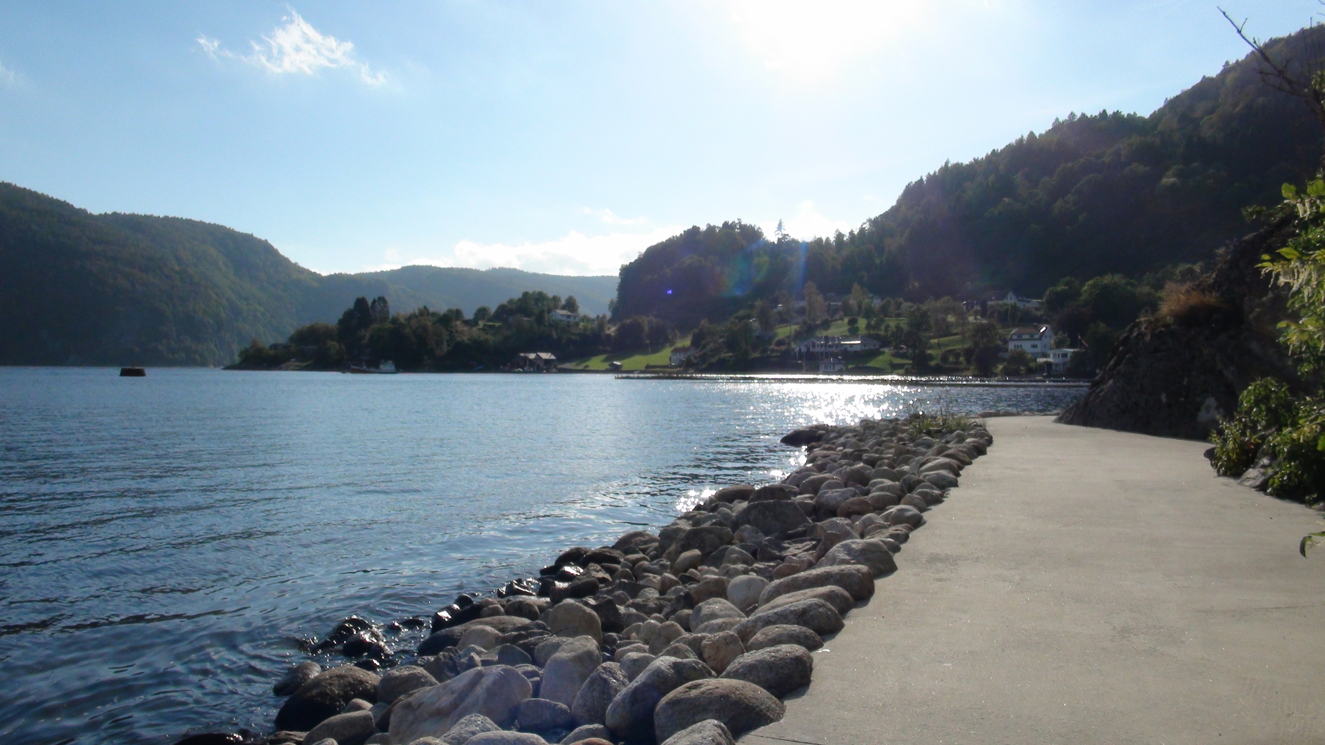 Mitten in Feda gibt es eine kleine Brücke. Von dort hat man einen direkten Blick auf unsere Unterkunft, hoch über dem Feda-Fluß.