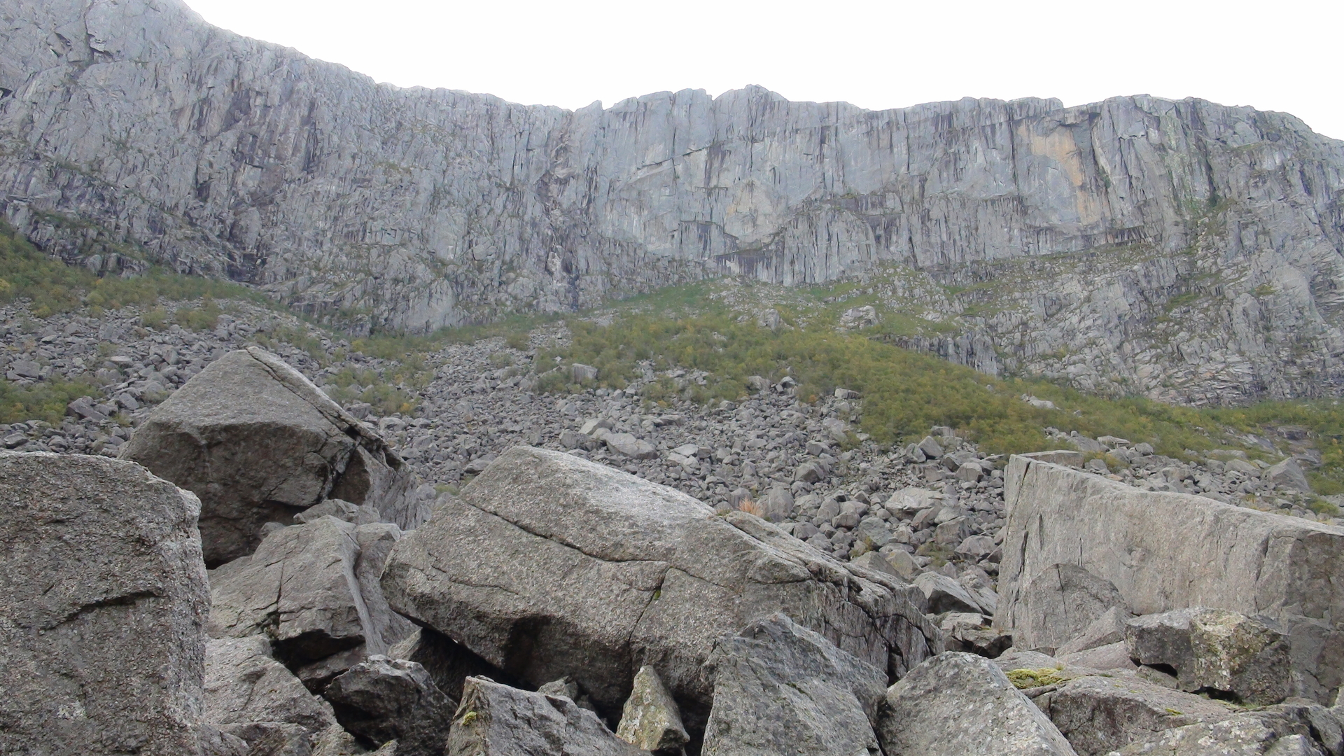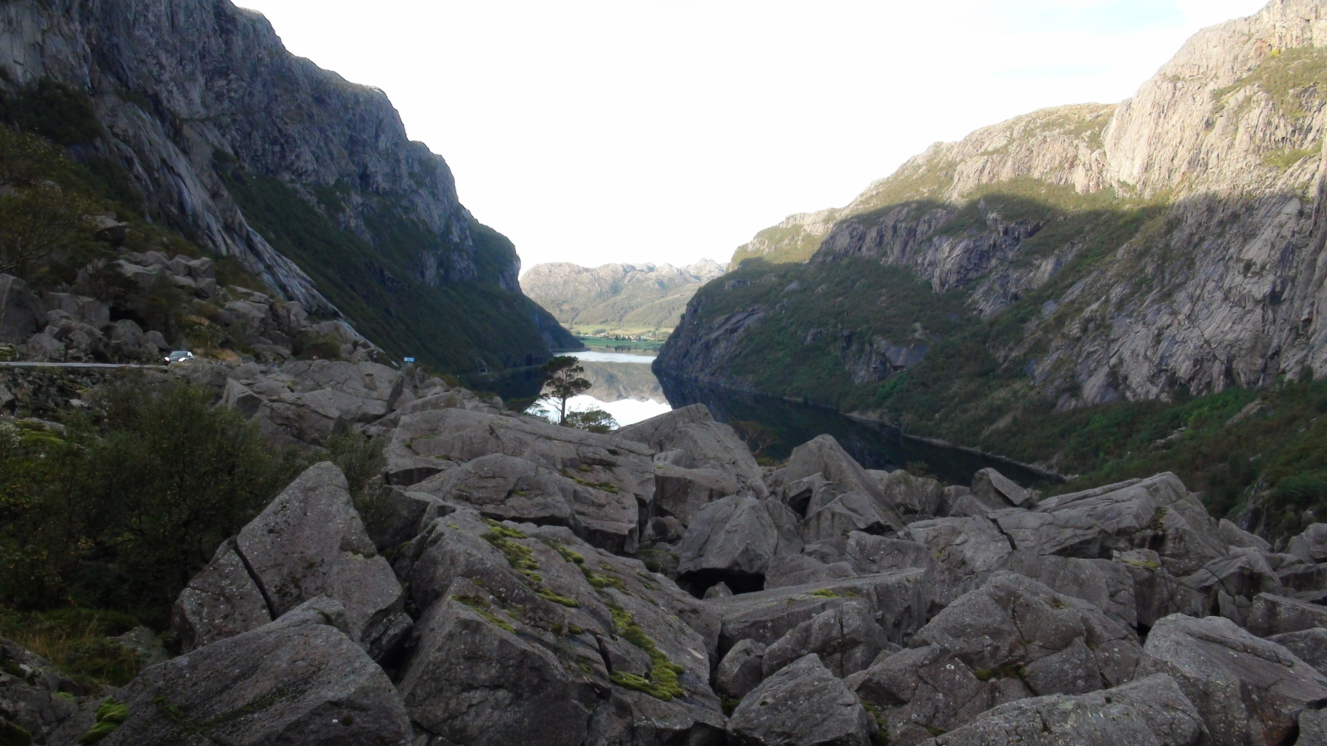 Die Straße führt mitten durch dieses Geröllfeld. Links und rechts dieser Straße türmen sich Riesenfelsbrocken an Riesenfelsbrocken. Teilweise sind sie so groß wie Wohnhäuser. Vor 10.000 Jahren sprengte Frost diese Gesteinsmengen von den Felswänden. Auch die Felswände um uns herum sind steil und himmelhoch. Winzig klein kommt man sich hier vor. Ehrfürchtig stehen wir vor diesen Geröllmassen und es wird einem schon mulmig. Hoffentlich bleibt auch alles so schön liegen, nicht das hier einiges ins Rollen kommt. Man muss das mal mit eigenen Augen gesehen haben. Es ist wirklich sehr eindrucksvoll und sehr empfehlenswert, sich dieses Geröllfeld anzusehen!!!!!