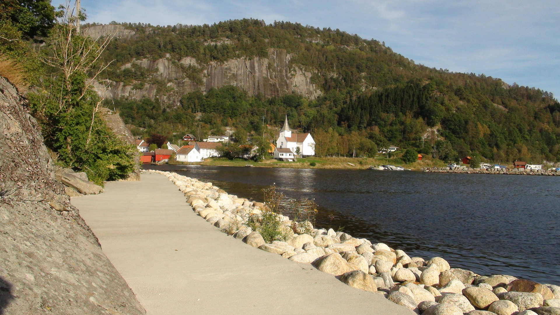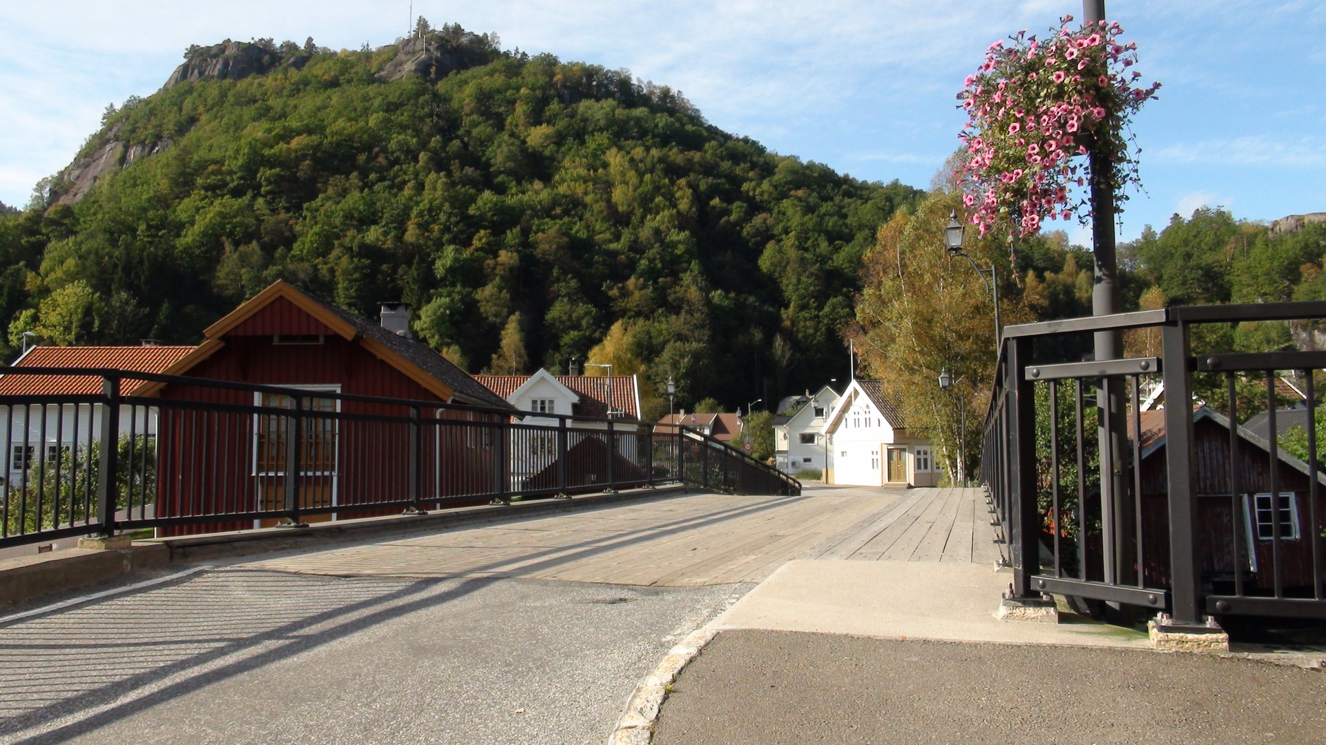 Mitten in Feda gibt es eine kleine Brücke. Von dort hat man einen direkten Blick auf unsere Unterkunft, hoch über dem Feda-Fluß.