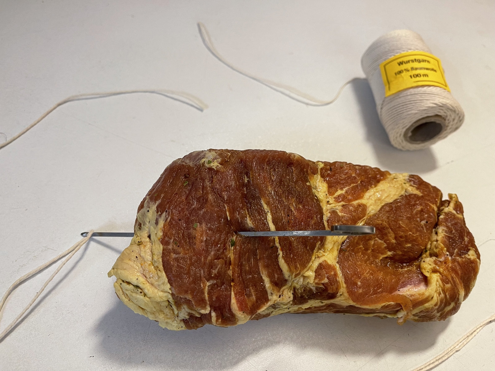 Sorgfältig gebunden kommt optisch natürlich besser an, aber ich will den Schinken ja nicht verkaufen, sondern selbst essen.