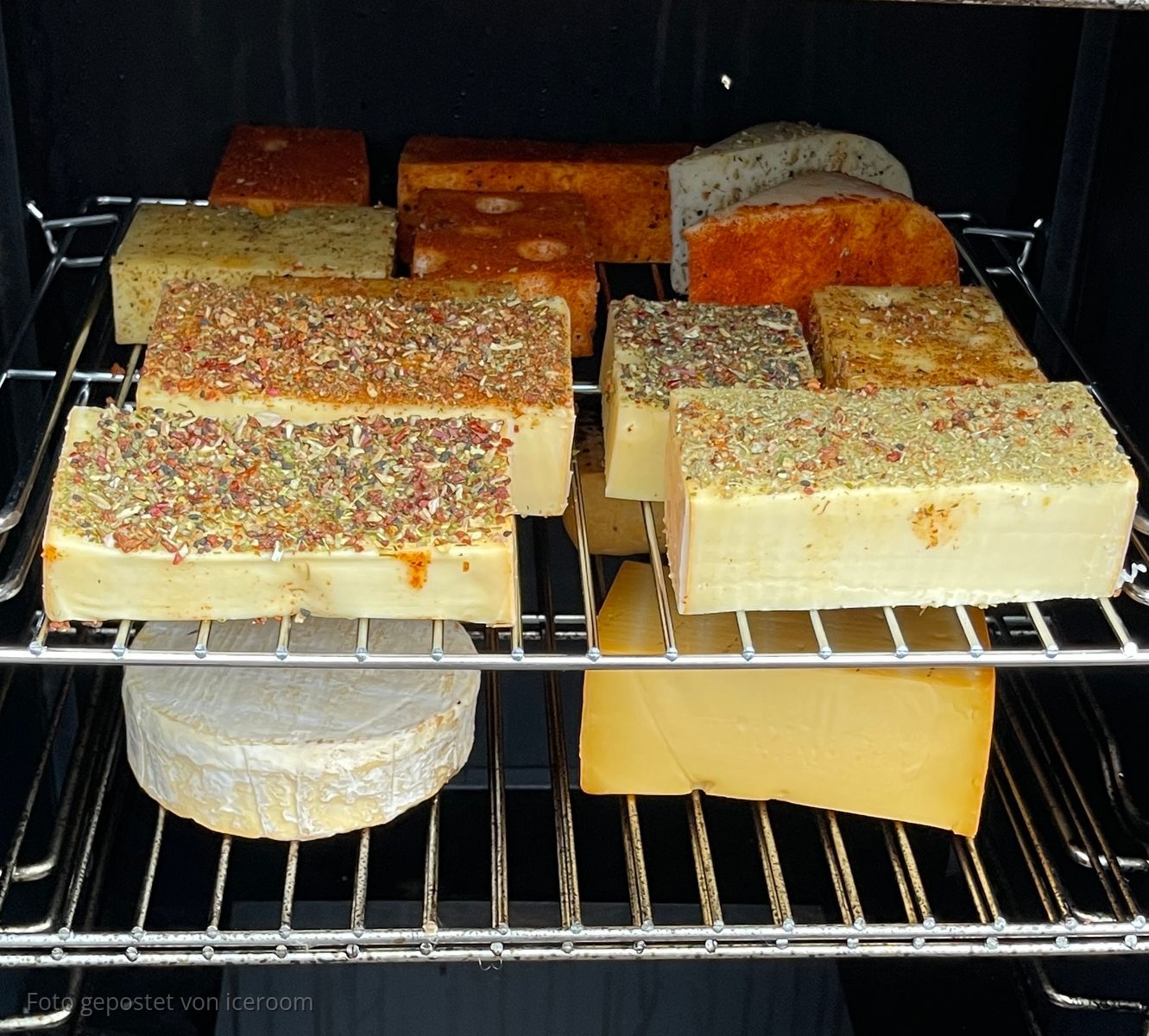 Emmentaler, junger Gouda, mittelalter Gouda, je 2x und ein Stück Ziegenkäse sowie 1 Stück Camembert befinden sich nach einer Wellnessbehandlung mit diversen Kräuterchen nun im Rauch.