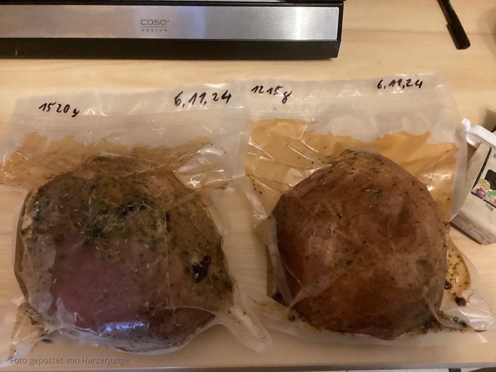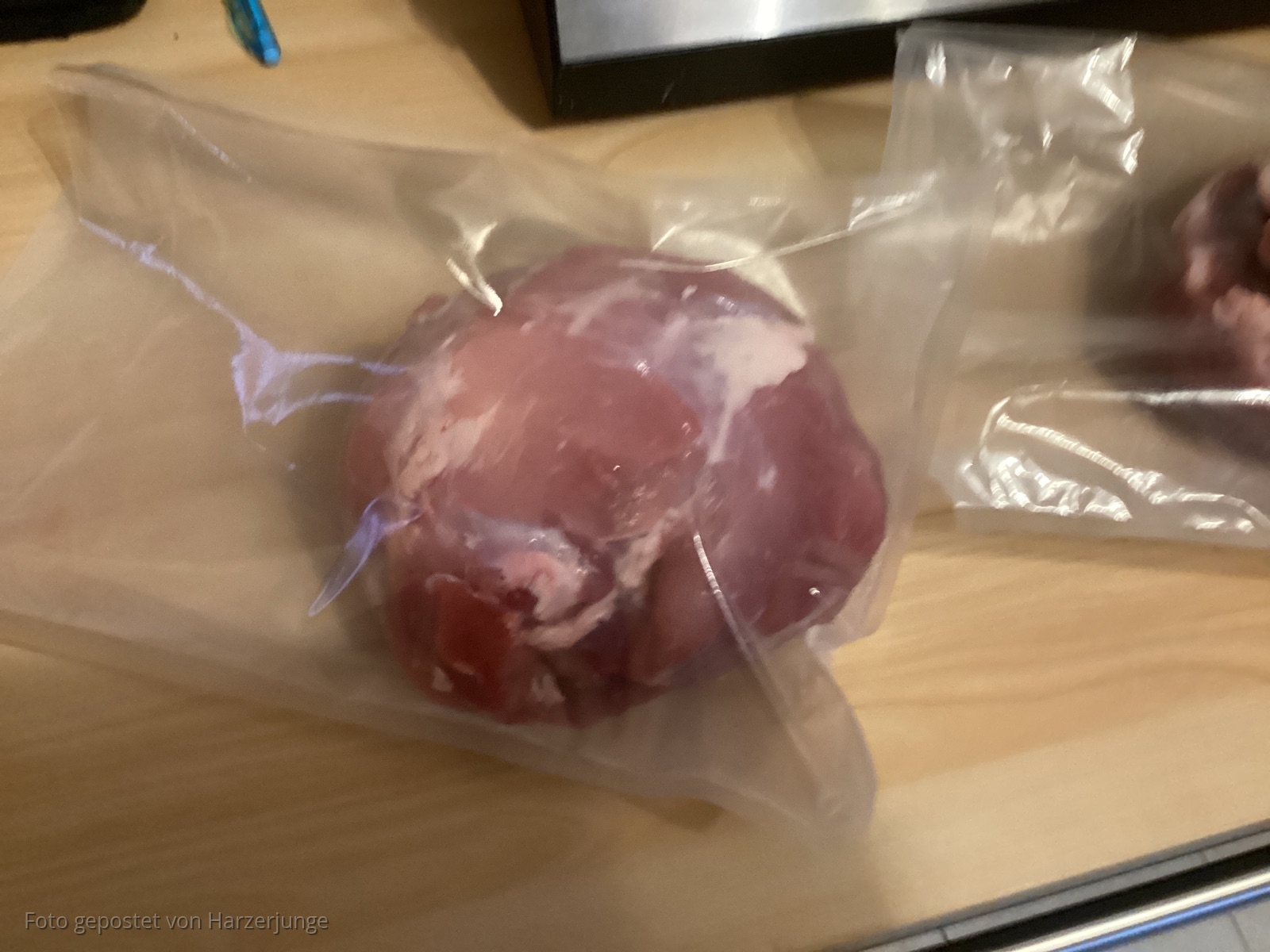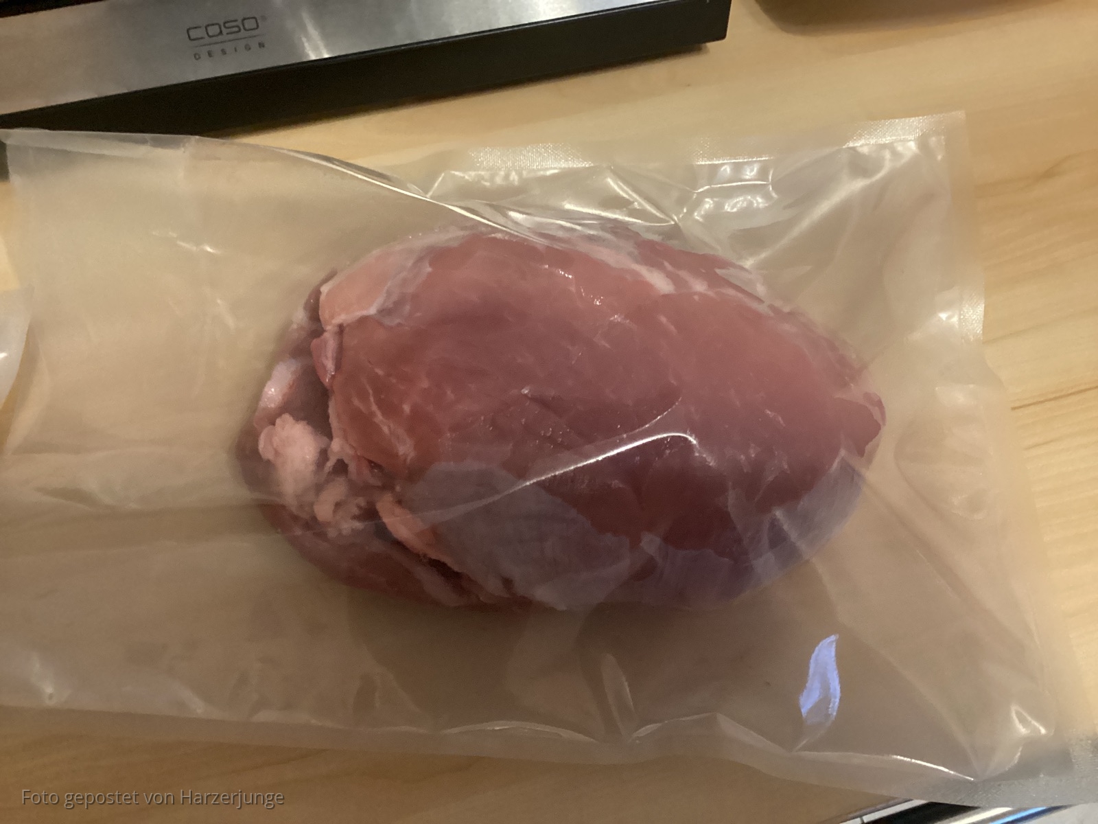 Ich habe mir beim Fleischer meines Vertrauens, zwei Schweinenüsse bestellt und die sind jetzt zur Verwandlung zum Nuss Schinken in die Vakuumbeutel gewandert und nach ca drei Wochen ab in denn Rauch