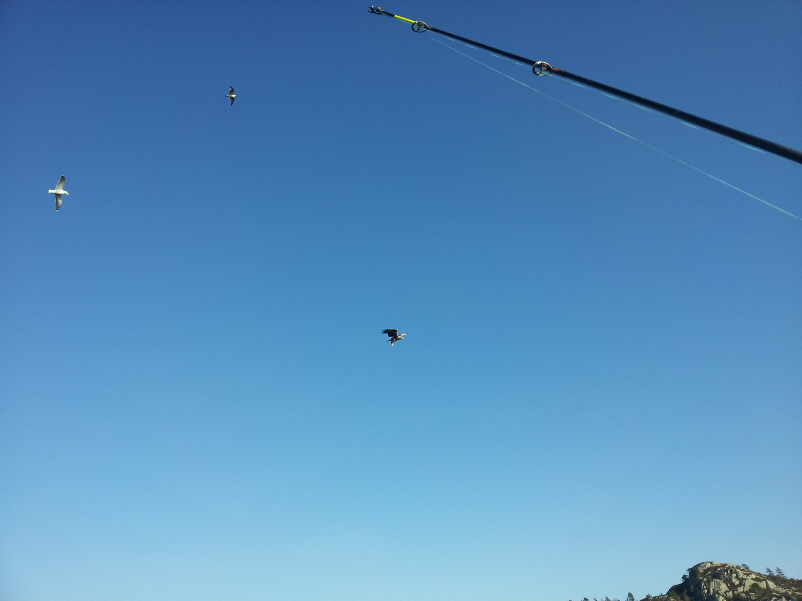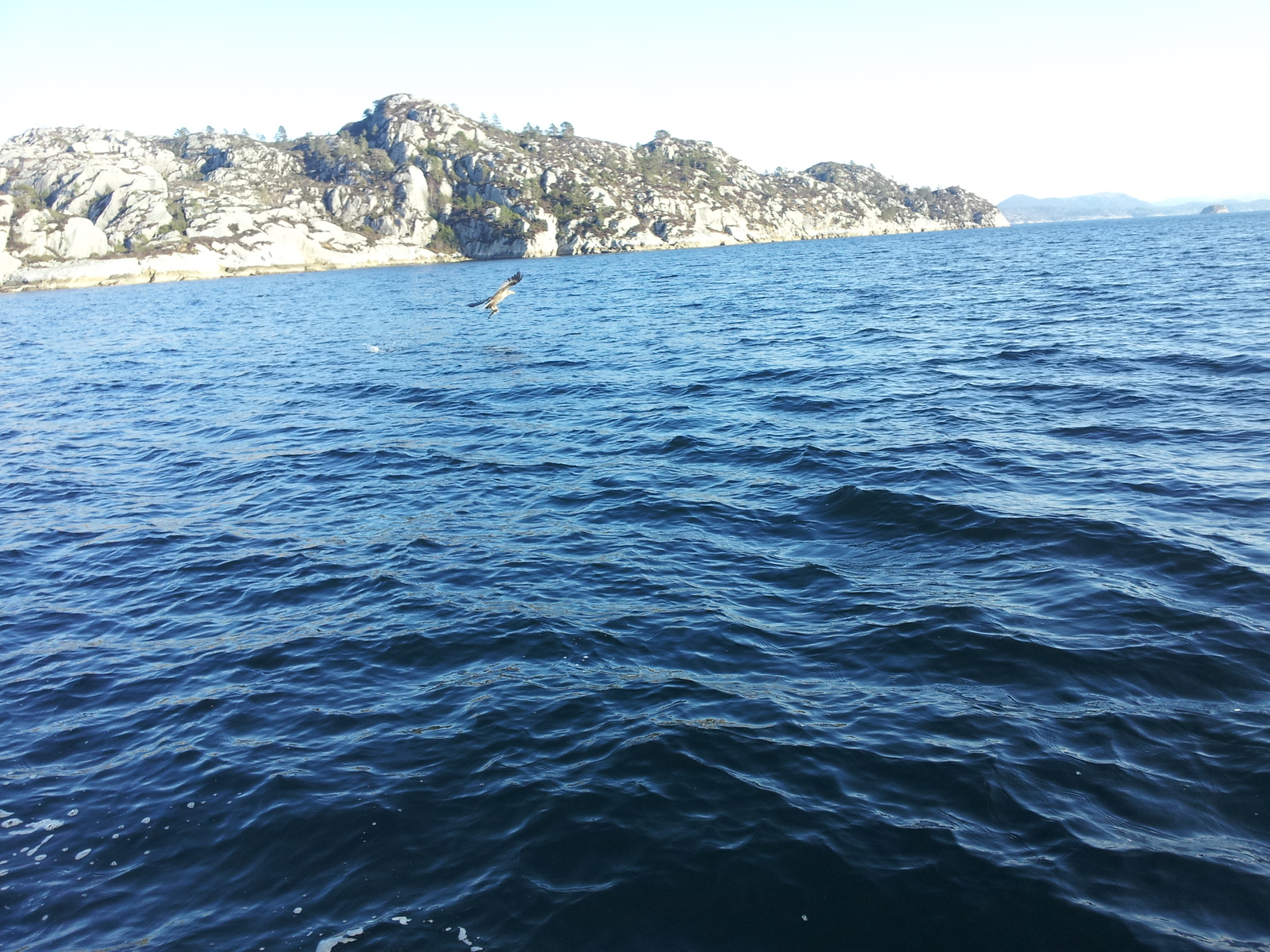 Ein zurückgesetzter Seelachs, der den Weg Richtung Meeresgrund nicht mehr schaffte, wurde von einer Möwe verschluckt, die ihn dann beim Versuch wegzufliegen, wieder verlor. Sofort waren ein paar Kollegen von ihr am Himmel, die jedoch vor einem Seeadler Respekt hatten, der sich den Fisch von der Wasseroberfläche griff und zur nächsten Insel flog.