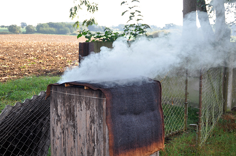 Nebenbei habe ich schon mal den Ofen vorgeheizt und schon geht es los mit ordentlich Qualm: