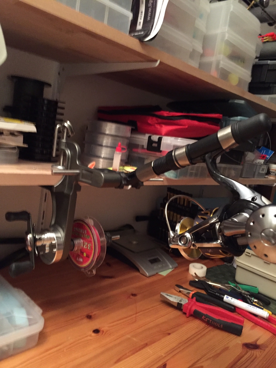 in die Bohrmaschine spanne ich die Schnurspule mit M 8 Schraube und denn wird ganz normal mit Rute und Rolle aufgespult.