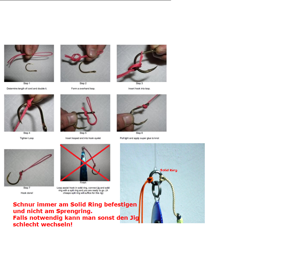 Auf dem Bild im Anhang habe ich die gezeigte Montage durchgestrichen. Den Vorteil die Hauptschnur und die Assist Haken an einen Solid Ring zu befestigen anstatt an einen Sprengring wird man schnell feststellen wenn während des Angelns auf eine andere Farbe oder ein anderes Pilkergewicht gewechselt werden muß! Dann läßt sich der Pilkr/Jig schnell aus dem Sprenring entnehmen/montieren ohne das es zu langer Fummelei kommt den/die Assist Haken vom Sprengring zu befreien/montieren. Wenn die Hauptschnur dann auch noch