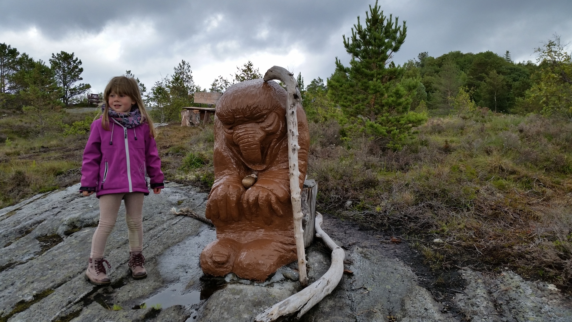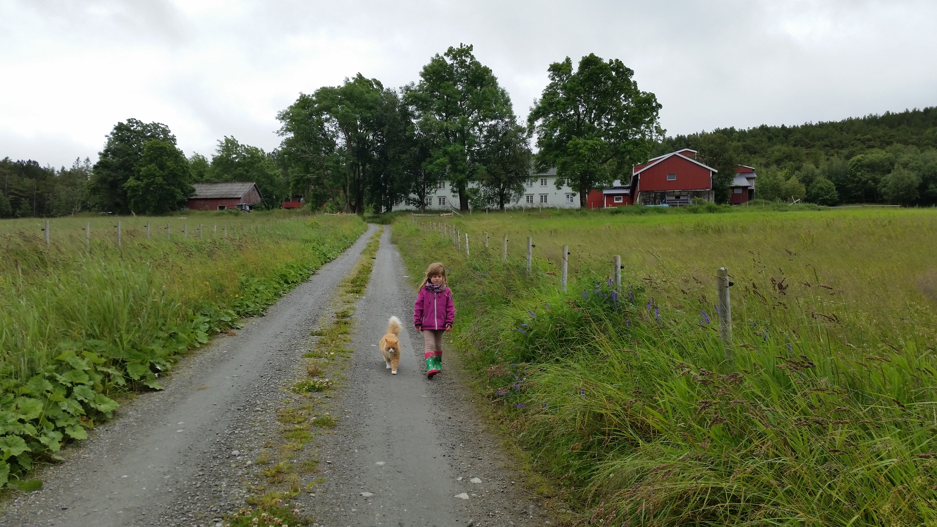 Am Abend um 22:30 Uhr kamen dann unsere Vermieter Torill und Per Arthur und überbrachten uns die Bootsschlüssel. Hier ticken die Uhren halt anders. Der nächste Tag brachte immer noch keine Wetterbesserung. Also wanderten wir wieder los… Unsere Tochter fand schnell einen neuen Freund, der uns über mehrere Kilometer über Stock und Stein folgte.