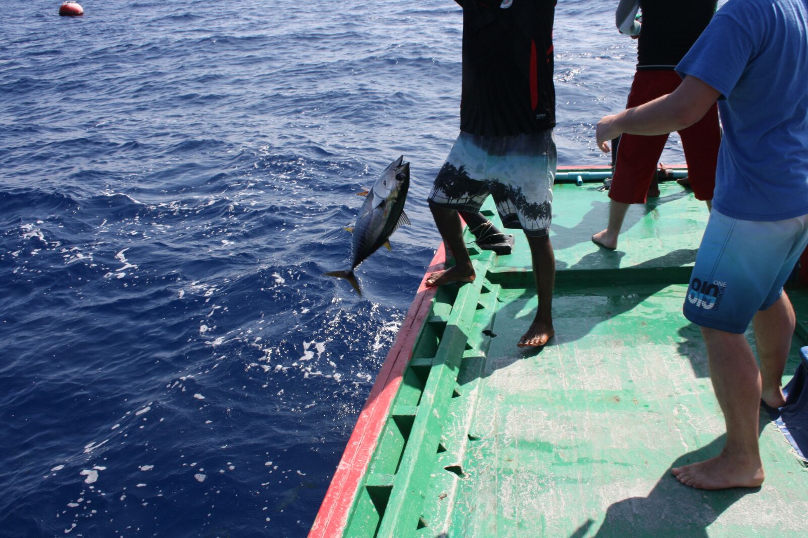 Im Aussenatoll wurde dann auf Thunfisch geangelt und mit den Köderfischen angefüttert. Anfangs hatten alle drei die Ruten krumm und nachdem sich dann Delfine zu uns gesellten, ging eigentlich kaum was.